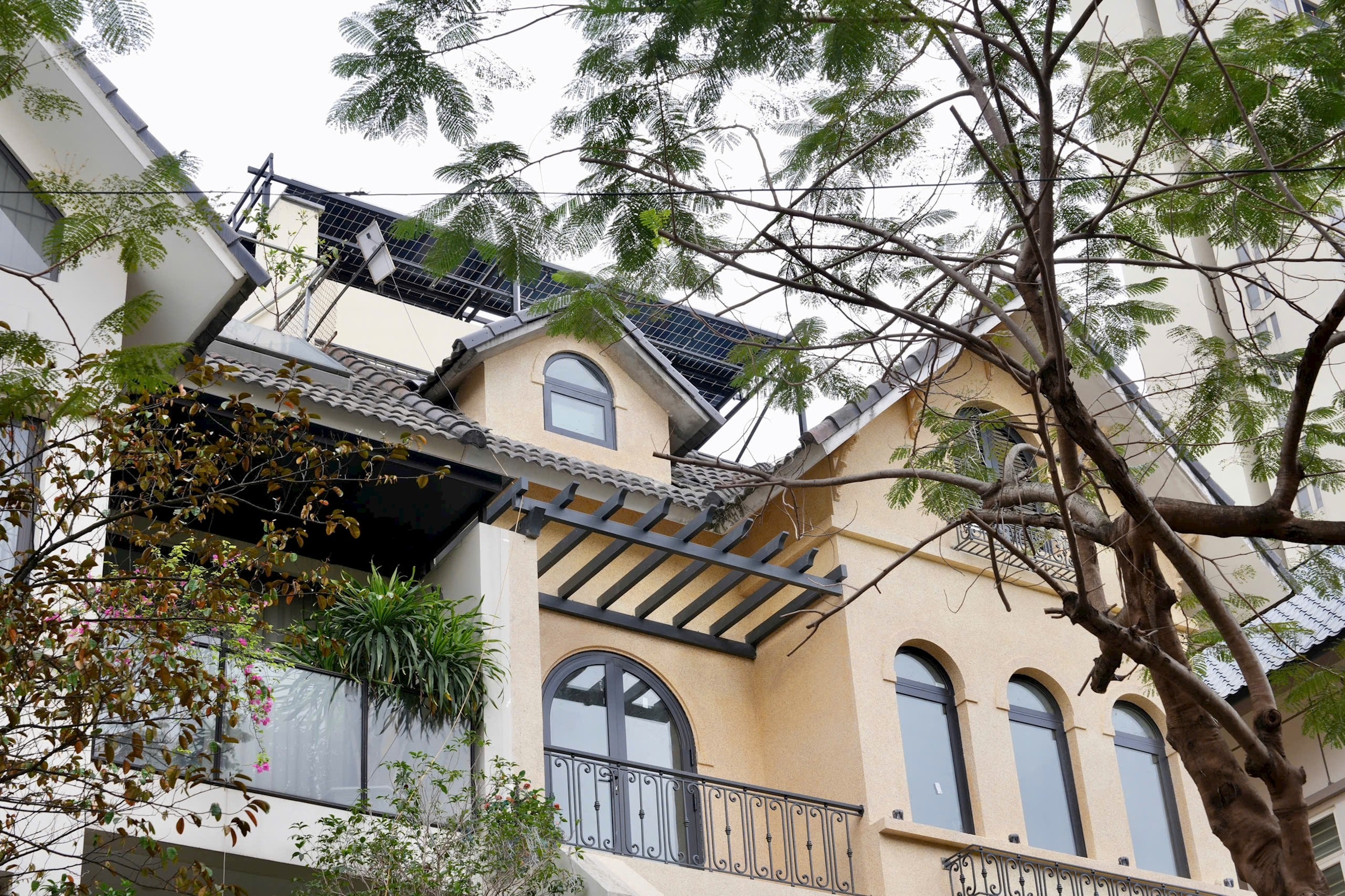 Công trình có lắp máy pin năng lượng mặt trời kết hợp mái che đã phá vỡ cảnh quanh thiết kế được duyệt. Ảnh: Linh Anh.