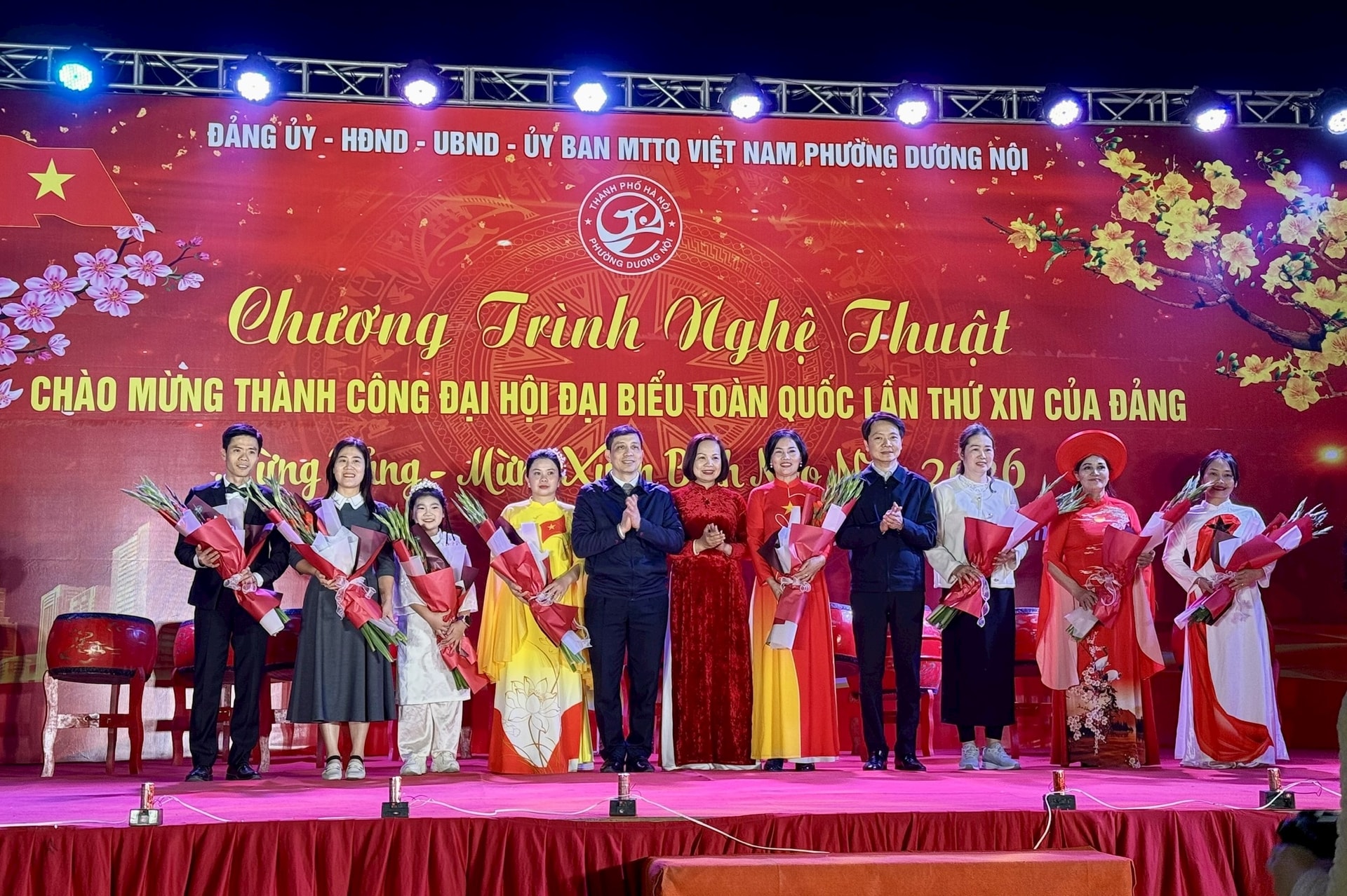 Đại diện lãnh đạo phường Dương Nội tặng hoa cảm ơn những đơn vị tham gia biểu diễn văn nghệ. Ảnh: PV