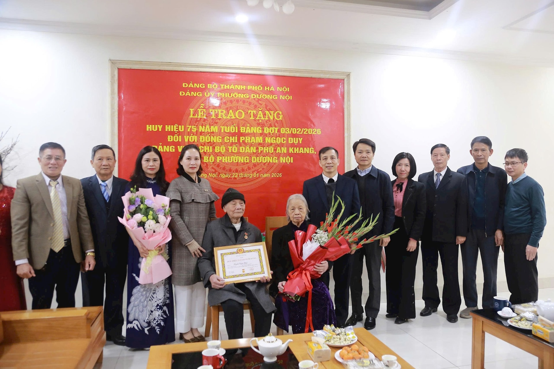 Bí thư Đảng ủy, Chủ tịch HĐND phường Dương Nội Cấn Thị Việt Hà cùng đại diện Ban Xây dựng Đảng và Văn phòng Đảng ủy phường đã đến thăm, trao Huy hiệu 75 năm tuổi Đảng tặng đảng viên lão thành Phạm Ngọc Dụy, Chi bộ tổ dân phố An Khang, Đảng bộ phường Dương Nội.