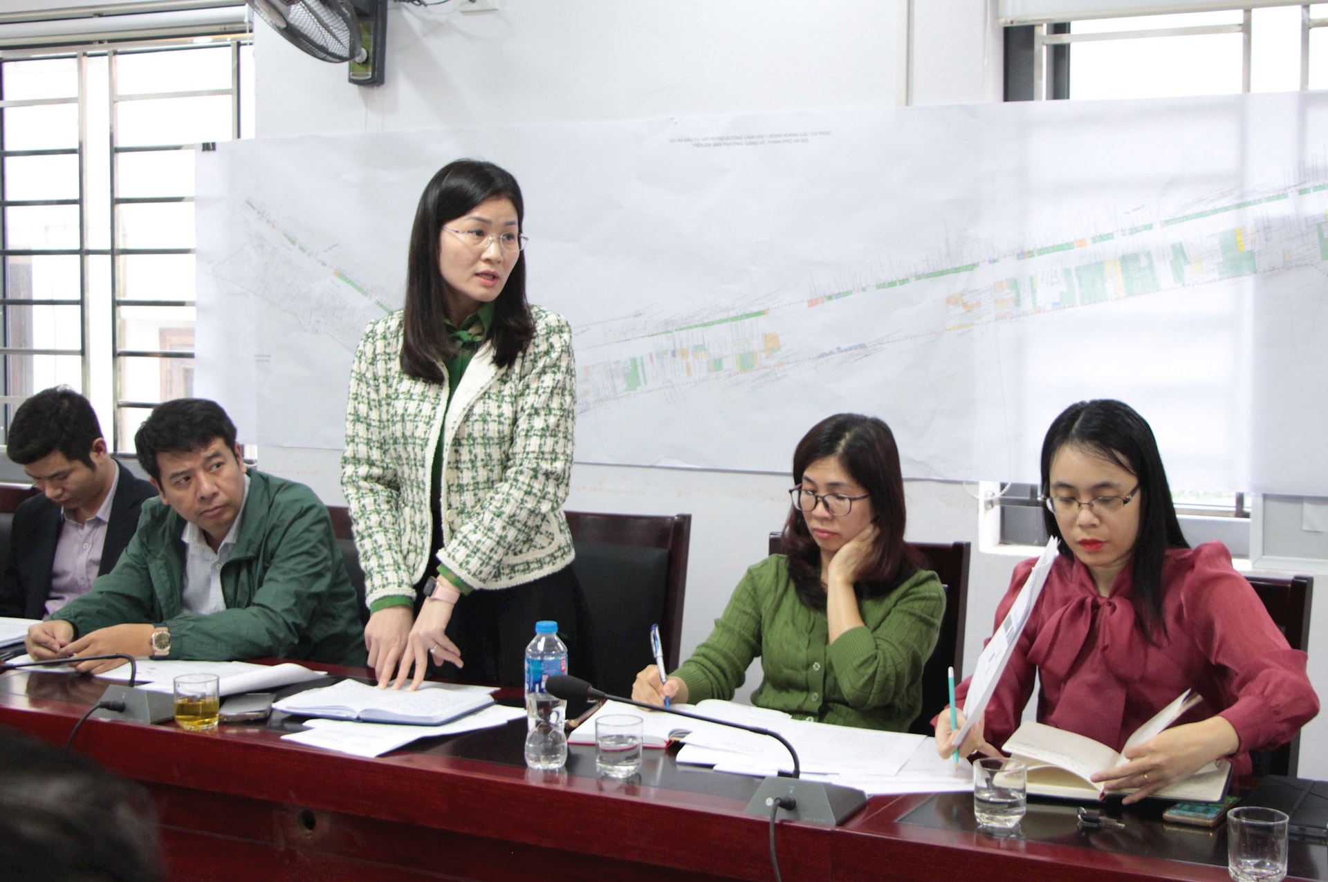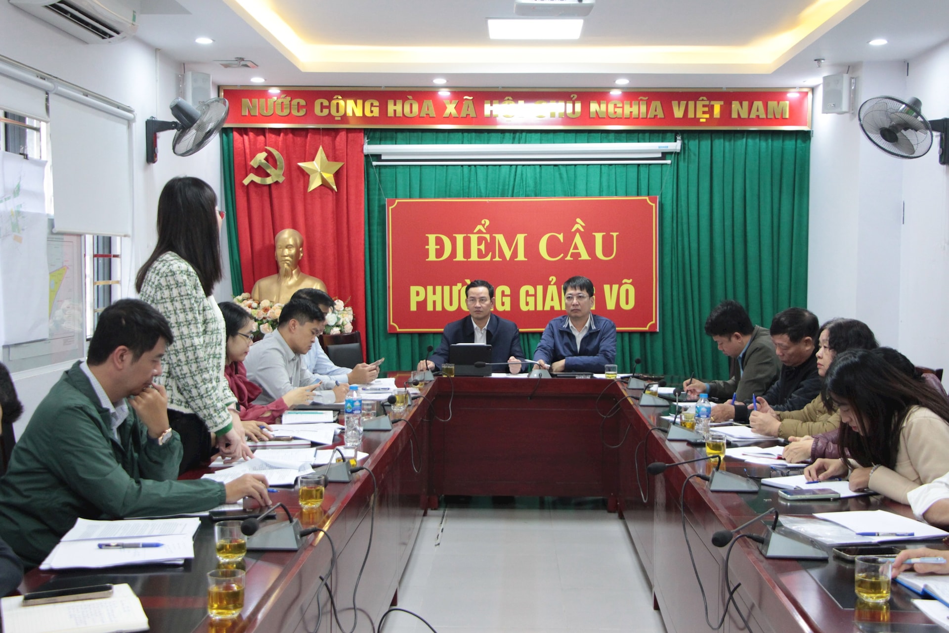 Đại diện Phòng Kinh tế, Hạ tầng và Đô thị phường Giảng Võ báo cáo tại cuộc họp. Ảnh: MH