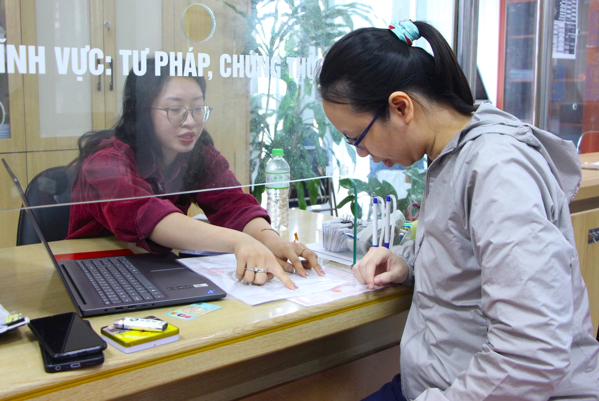 Cán bộ hướng dẫn người dân thực hiện thủ tục hành chính. Ảnh: MH