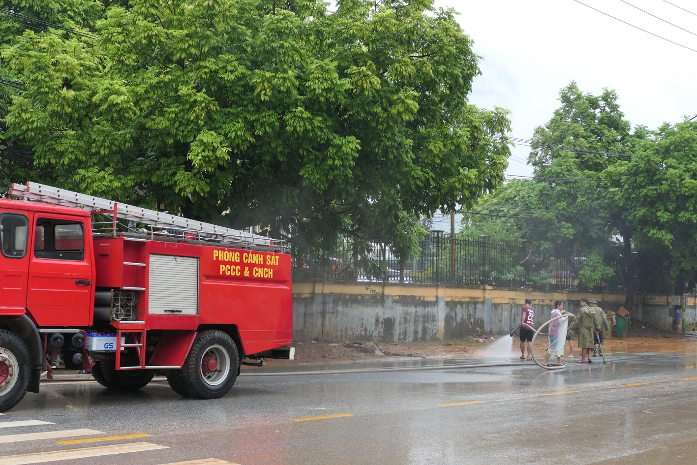 Công an tỉnh Tuyên Quang dùng xe chuyên dụng rửa bùn đất trên các tuyến đường.