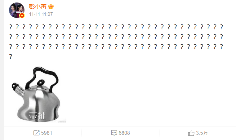Hashtag của đoàn phim bị người hâm mộ phản đối thì ngay lập tức, Bành Tiểu Nhiễm đăng trạng thái chứa "100 dấu hỏi chấm" trên trang Weibo cá nhân kèm ảnh một ấm nước méo mó. Động thái của cô được cho là đang "cà khịa" đoàn phim bóp méo hình tượng nhân vật.