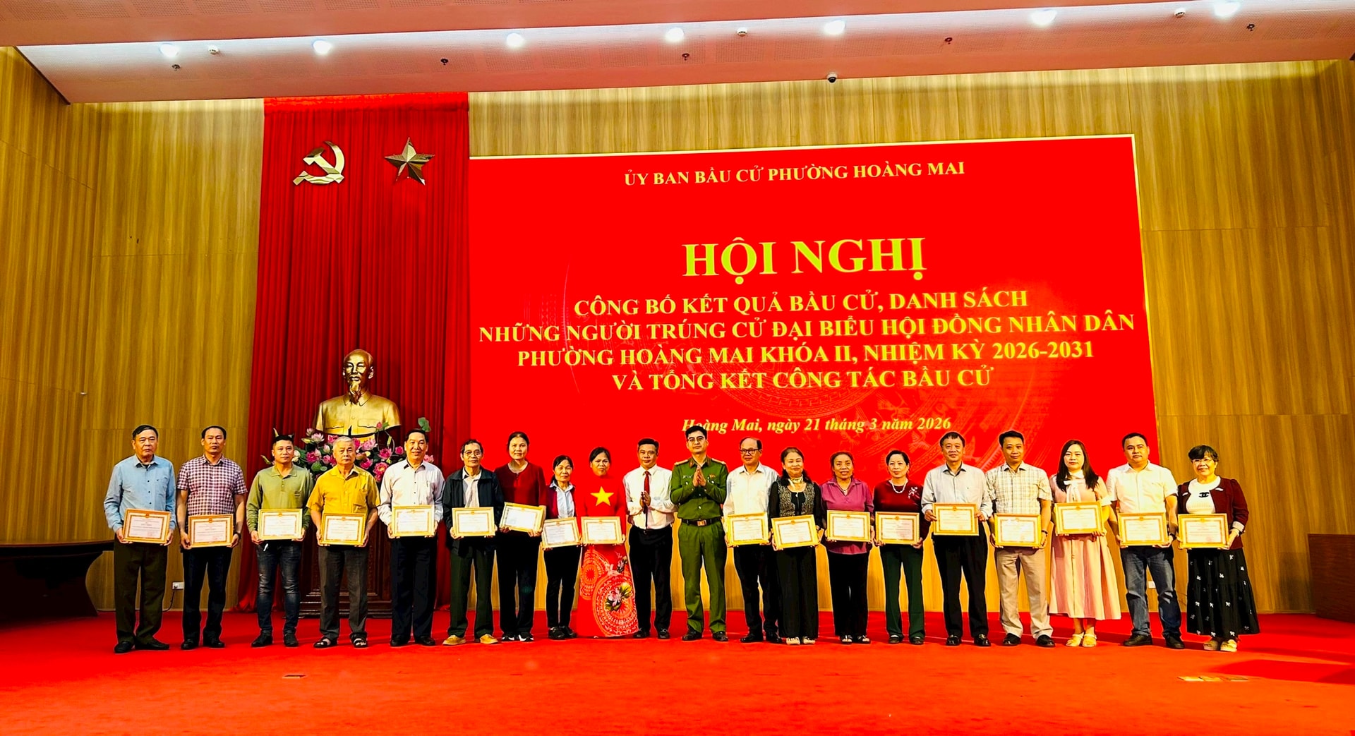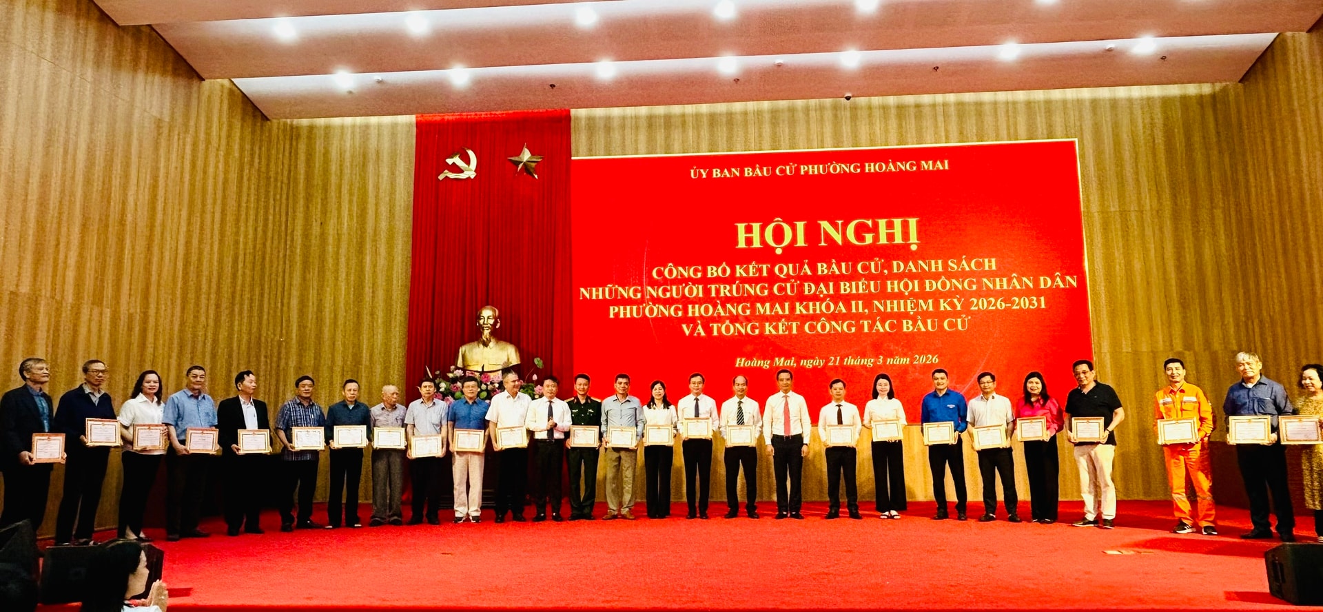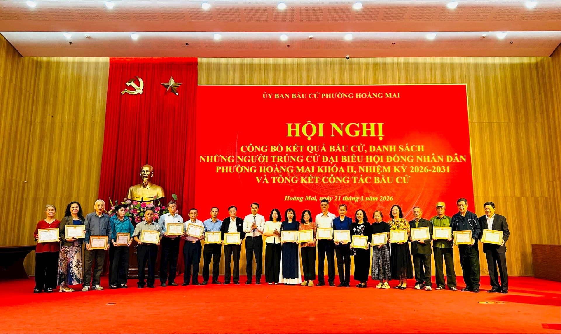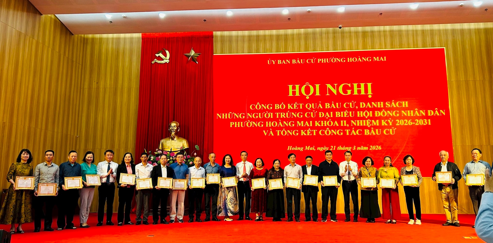 Trong hội nghị tổng kết, Ủy ban Bầu cử phường Hoàng Mai đã khen thưởng 99 tập thể và 350 cá nhân có thành tích xuất sắc trong công tác bầu cử đại biểu Quốc hội và đại biểu HĐND các cấp, nhiệm kỳ 2026-2031.