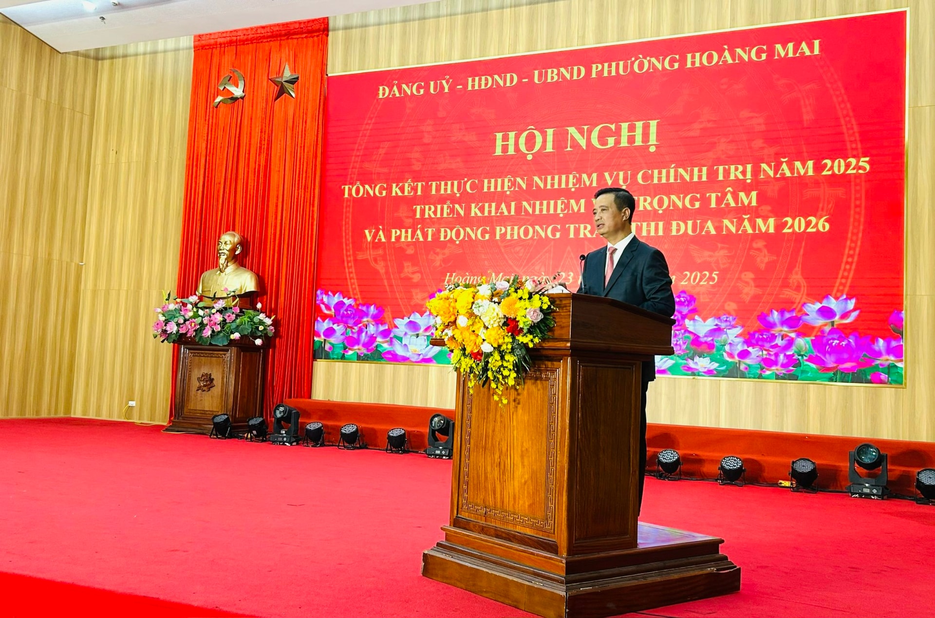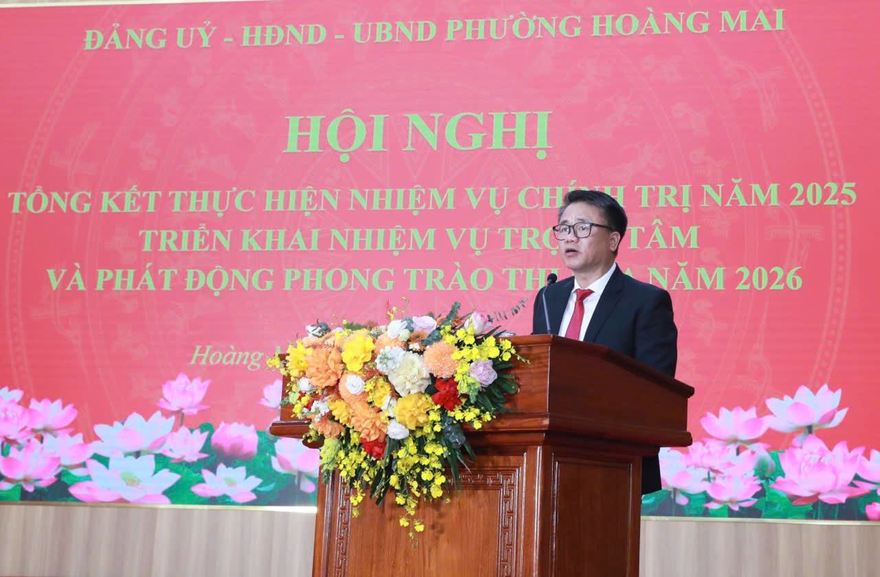 Phát biểu tại hội nghị, Bí thư Đảng ủy, Chủ tịch HĐND phường Hoàng Mai Nguyễn Xuân Linh nhấn mạnh, Ban Thường vụ Đảng ủy phường yêu cầu, HĐND, UBND, Ủy ban MTTQ Việt Nam phường, các tổ chức chính trị - xã hội, các tổ chức cơ sở Đảng, các cơ quan, đơn vị trên địa bàn bám sát các chương trình, kế hoạch công tác năm của Đảng ủy phường để triển khai thực hiện, phấn đấu hoàn thành các chỉ tiêu, nhiệm vụ năm 2026.