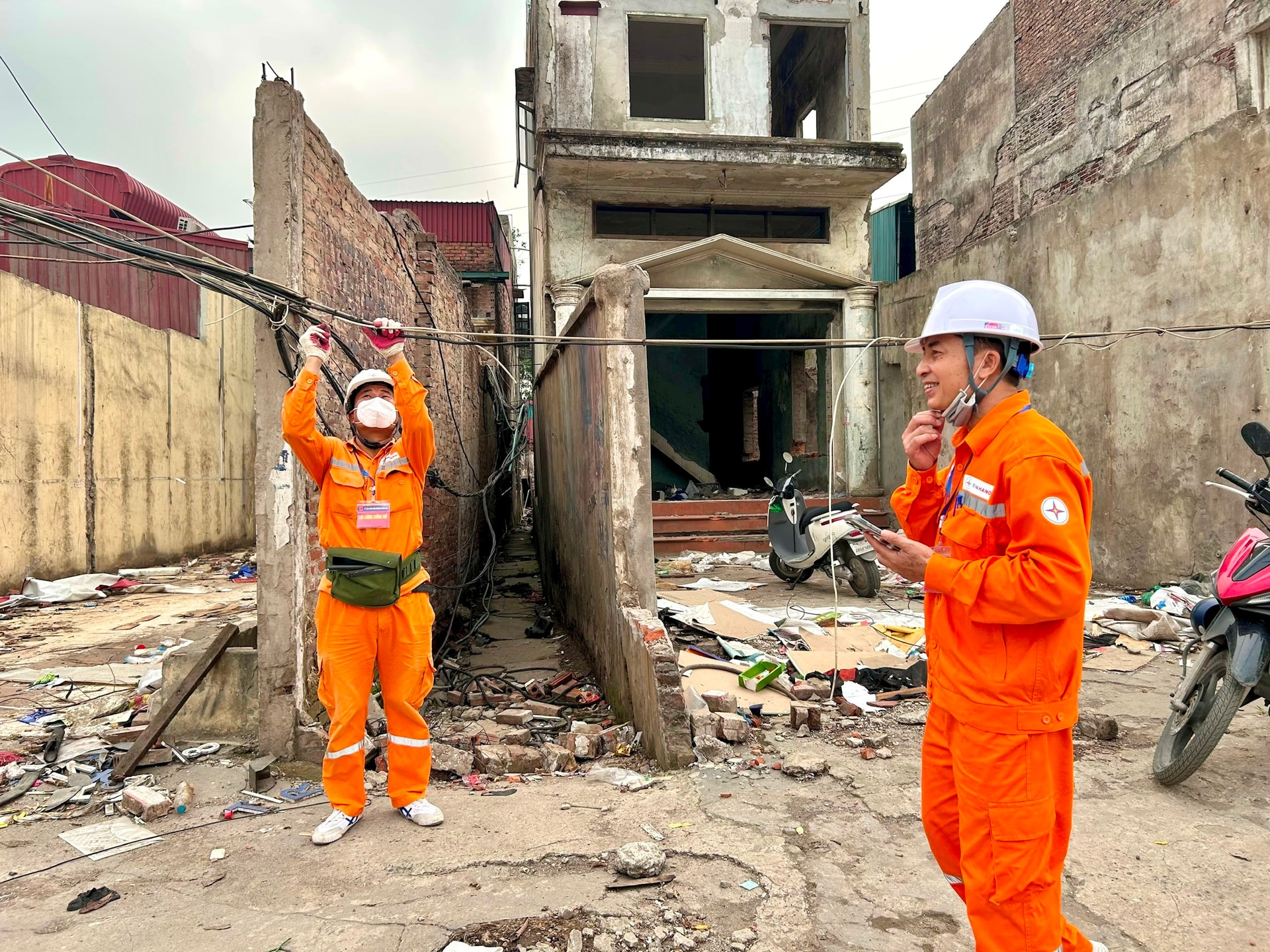 Nhân viên Công ty Điện lực Thanh Trì cắt điện để việc tháo dỡ công trình đảm bảo an toàn. Ảnh: Trần Oanh.