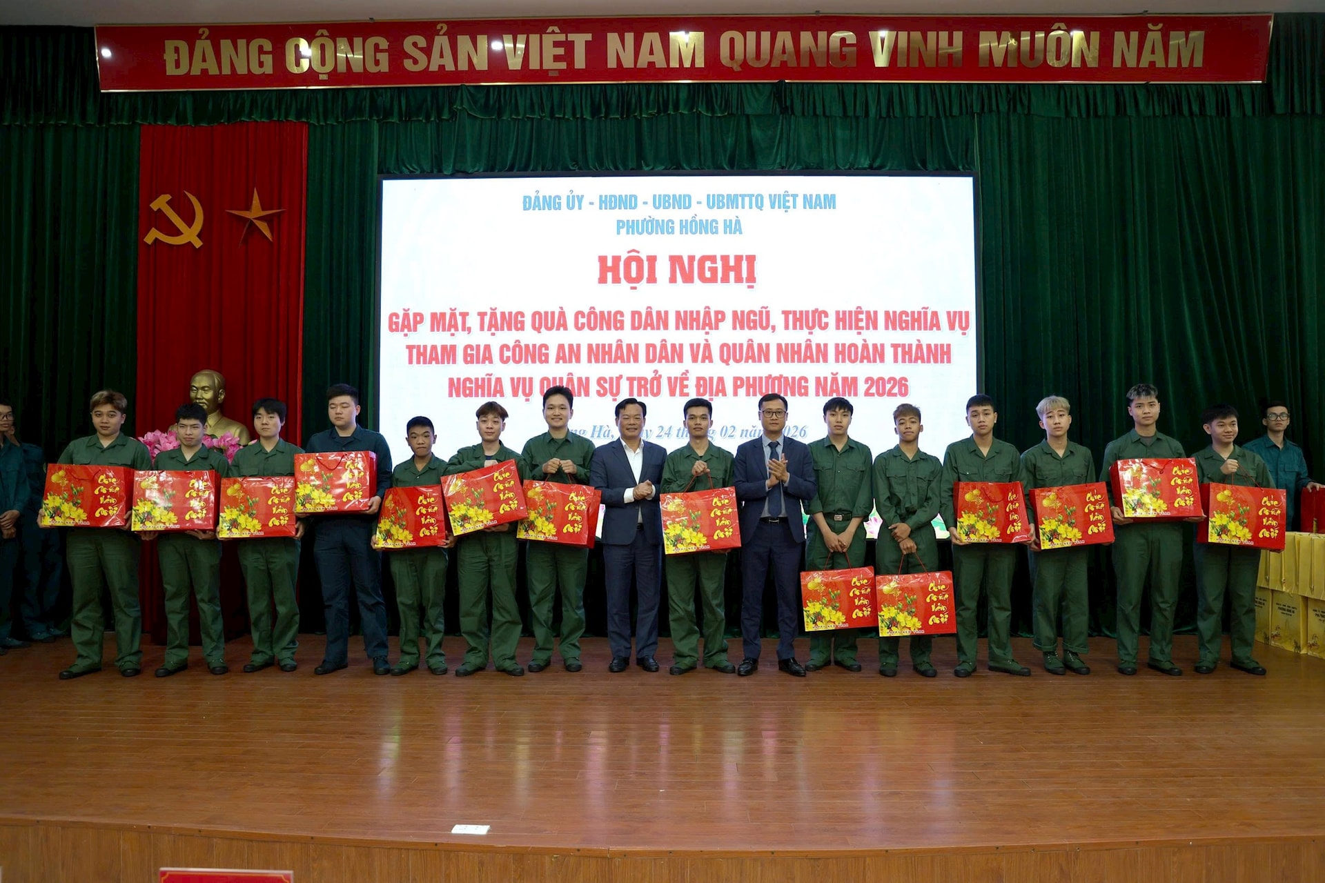 Bí thư Đảng ủy, Chủ tịch HĐND phường Hồng Hà Bùi Tuấn Anh và lãnh đạo phường Hồng Hà trao tặng quà các tân binh. Ảnh: Trung Nguyên