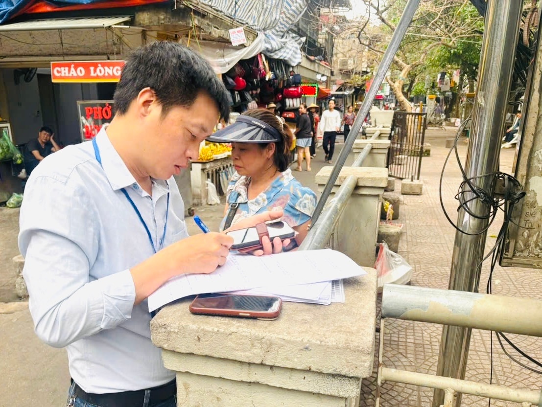 Lực lượng chức năng phường Kim Liên lập biên bản xử lý các trường hợp lấn chiếm không gian công cộng bày bán hàng sai quy định. Ảnh: PV