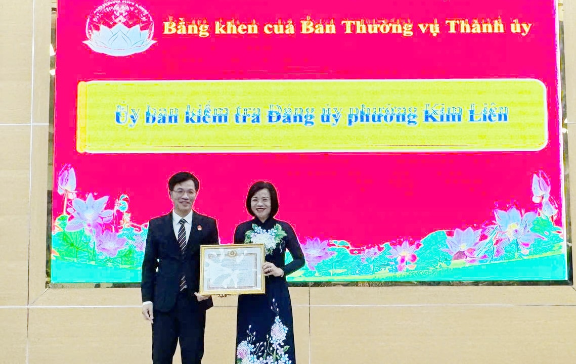 Ủy ban Kiểm tra Đảng ủy phường Kim Liên nhận Bằng khen của Ban Thường vụ Thành ủy Hà Nội. Ảnh: Thiện Huy