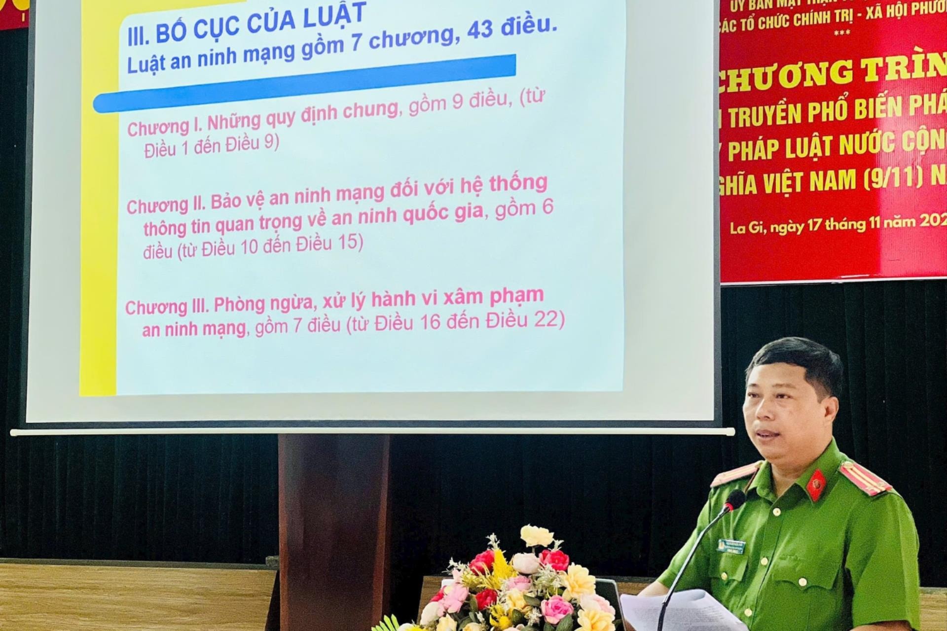 Tại buổi tuyên truyền, Trung tá Nguyễn Văn Tấp, Phó Trưởng Công an phường La Gi đã truyền đạt những nội dung quan trọng của Luật An ninh mạng, tập trung vào các nhóm hành vi bị nghiêm cấm.
