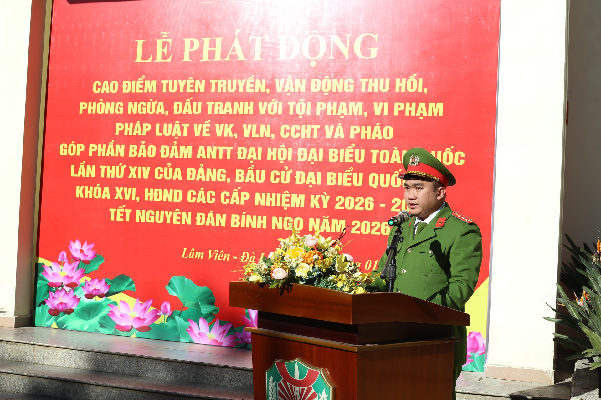 Phát biểu tại buổi lễ, Đại úy Lê Ngô Hồng Vũ, Trưởng Công an phường Lâm Viên - Đà Lạt nhấn mạnh việc tàng trữ, sử dụng trái phép các loại vũ khí, vật liệu nổ, công cụ hỗ trợ và pháo tiềm ẩn nhiều nguy hiểm, có thể gây hậu quả đặc biệt nghiêm trọng, ảnh hưởng trực tiếp đến tính mạng, tài sản của Nhân dân và trật tự, an toàn xã hội.