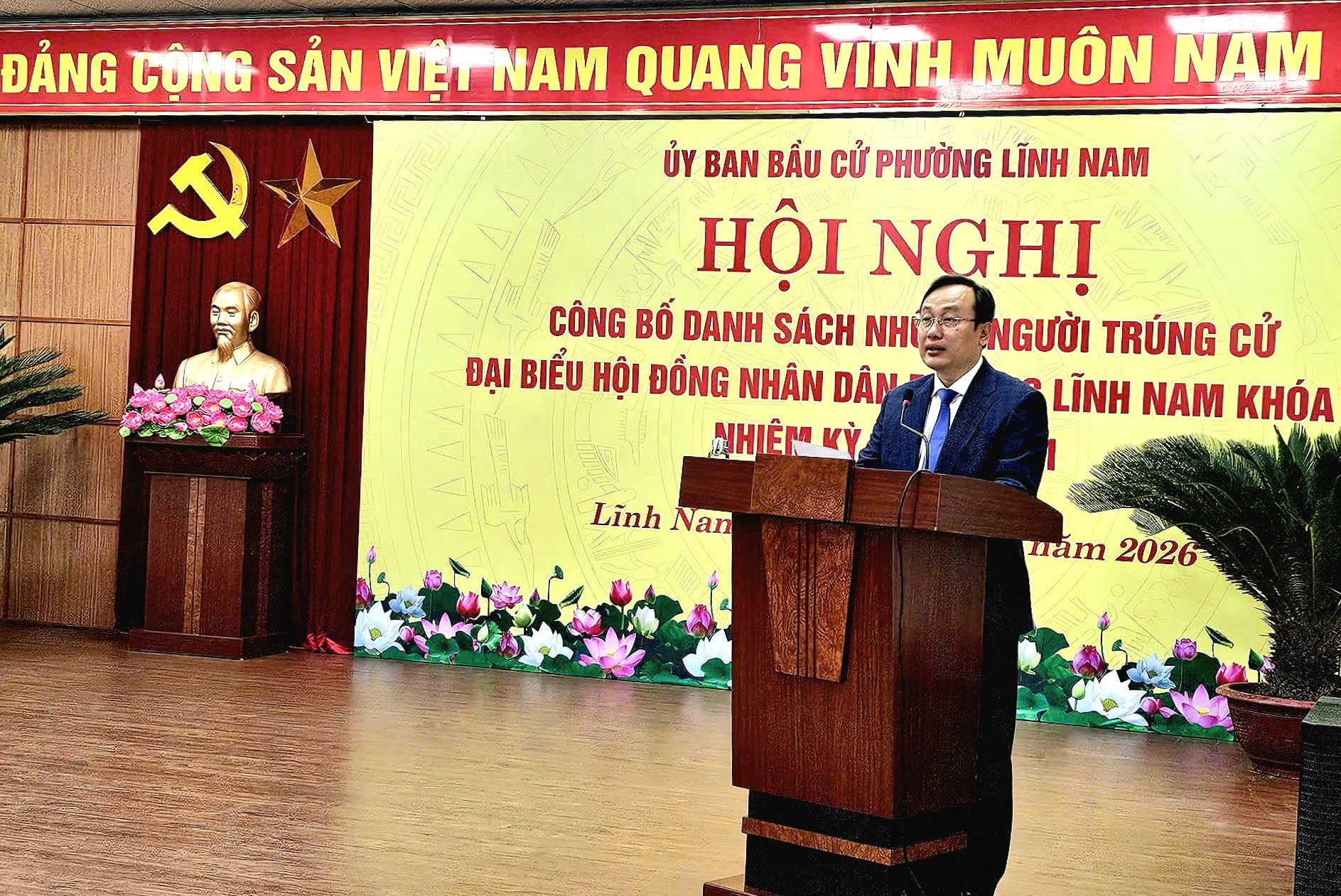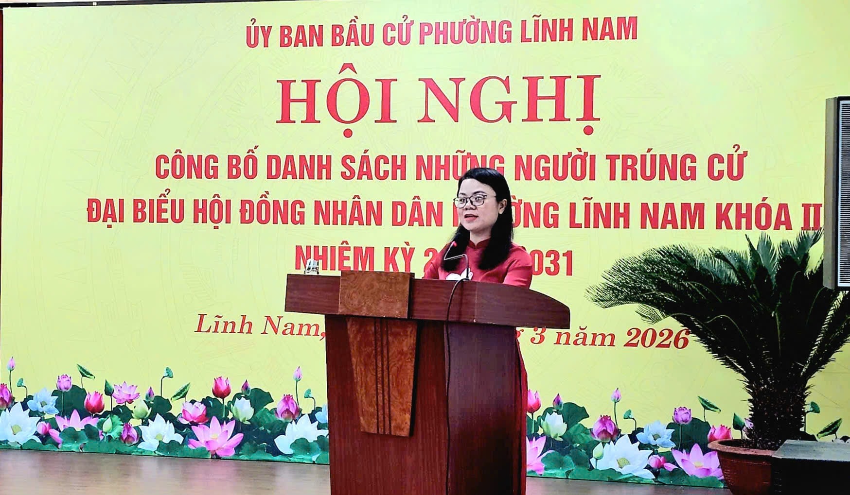 Ủy viên Ban Thường vụ, Phó Chủ tịch HĐND phường Lĩnh Nam Vương Thị Mai Hương - Phó Chủ tịch Ủy ban Bầu cử phường công bố danh sách những người trúng cử đại biểu HĐND phường Lĩnh Nam khóa II, nhiệm kỳ 2026-2031. Ảnh: PV