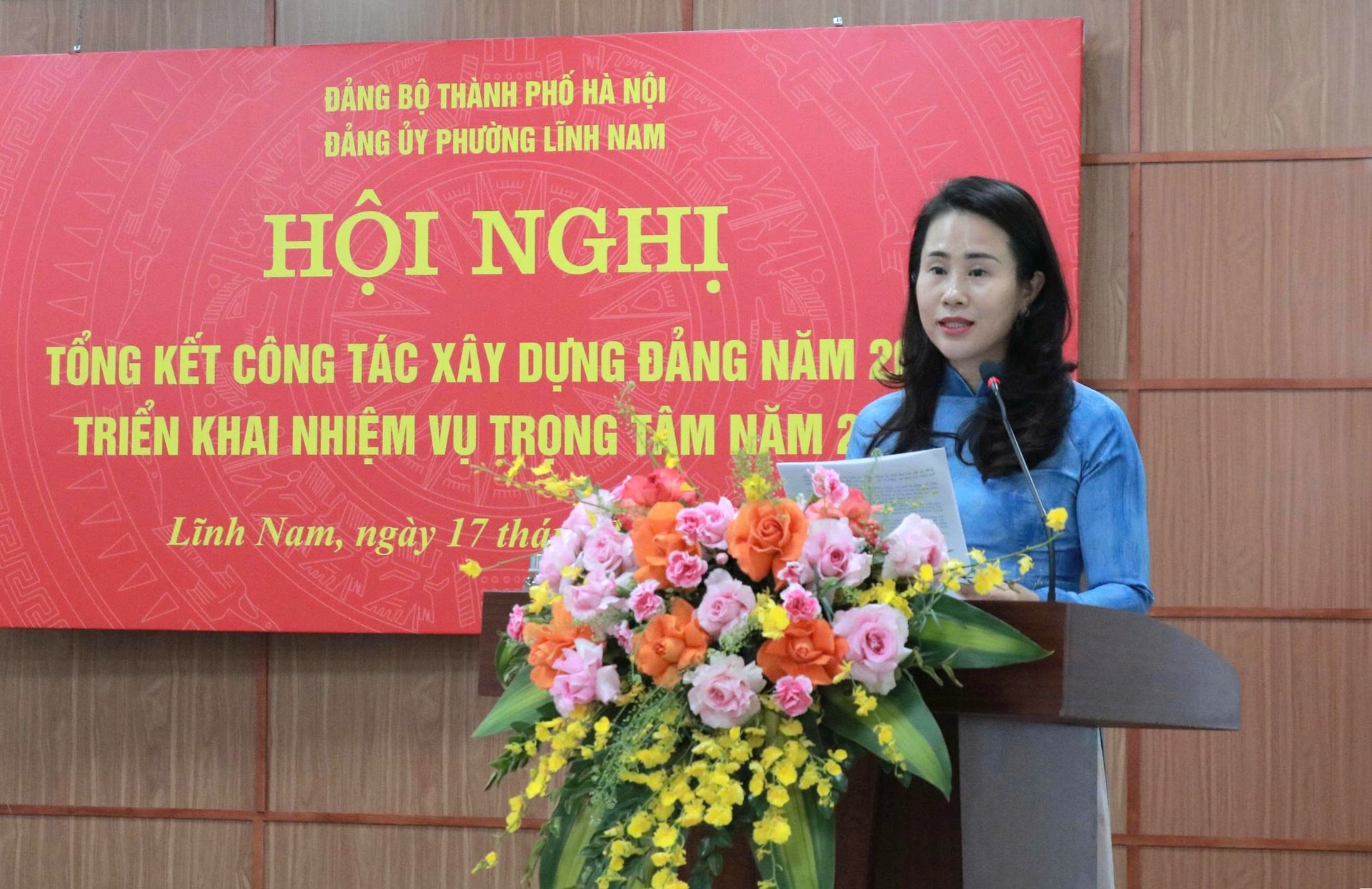Báo cáo tại hội nghị, Phó Bí thư Thường trực Đảng ủy phường Lĩnh Nam Đặng Thị Thanh Bình cho biết, trong năm 2025, các mặt công tác xây dựng Đảng và hệ thống chính trị tiếp tục được duy trì. Đại hội Đảng bộ phường Lĩnh Nam lần thứ I, nhiệm kỳ 2025-2030 được tổ chức thành công tốt đẹp; đã thông qua Nghị quyết, thống nhất 6 nhiệm vụ trọng tâm, 3 khâu đột phá.