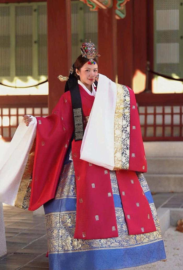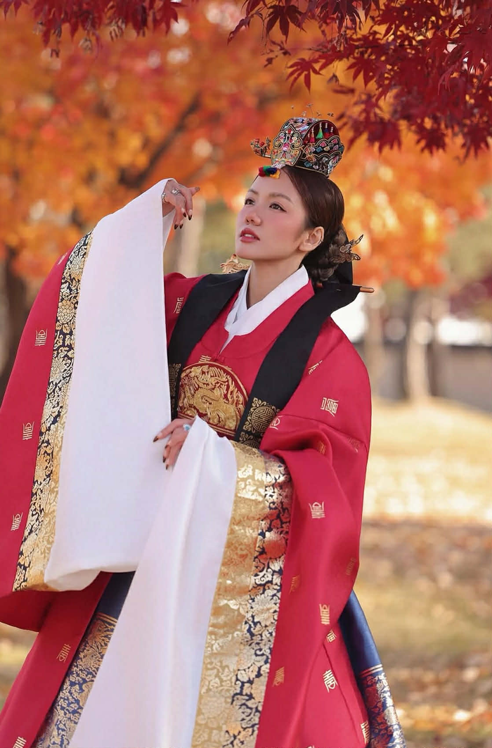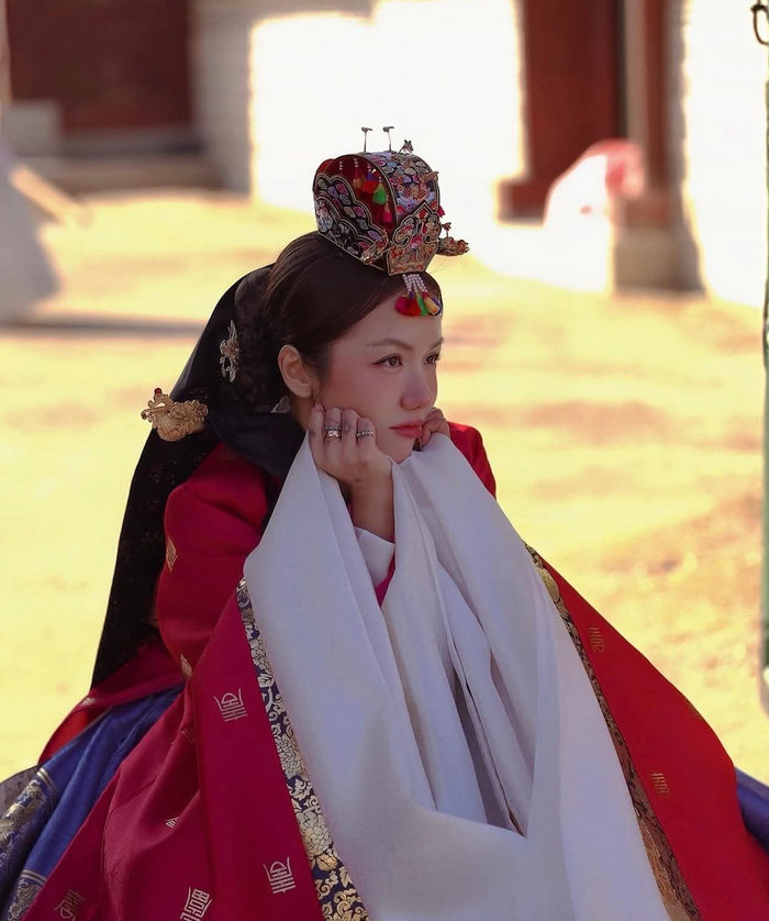 Phương Ly diện bộ hanbok truyền thống với tông đỏ - xanh chủ đạo, kết hợp cùng lớp áo choàng trắng phủ nhẹ phía trước. Vải áo được may cầu kỳ, các họa tiết vàng ánh kim chạy dọc thân áo tạo chiều sâu cho trang phục. Điểm nhấn nằm ở chiếc mũ nhỏ xinh, được đính kết bằng nhiều chi tiết thủ công, làm bật lên vẻ thanh lịch mà không cần đến quá nhiều phụ kiện.