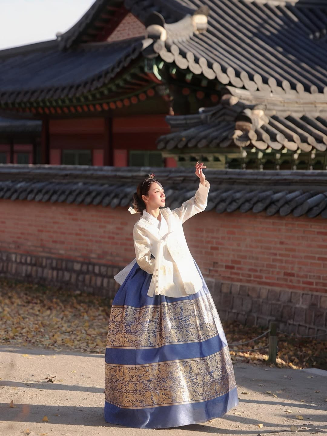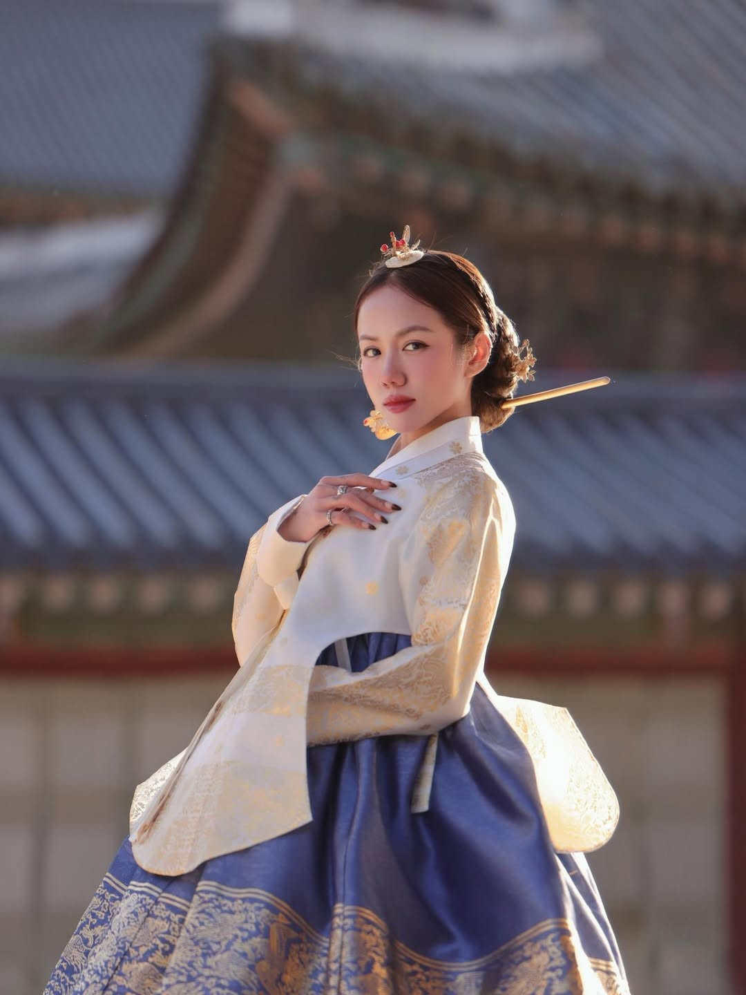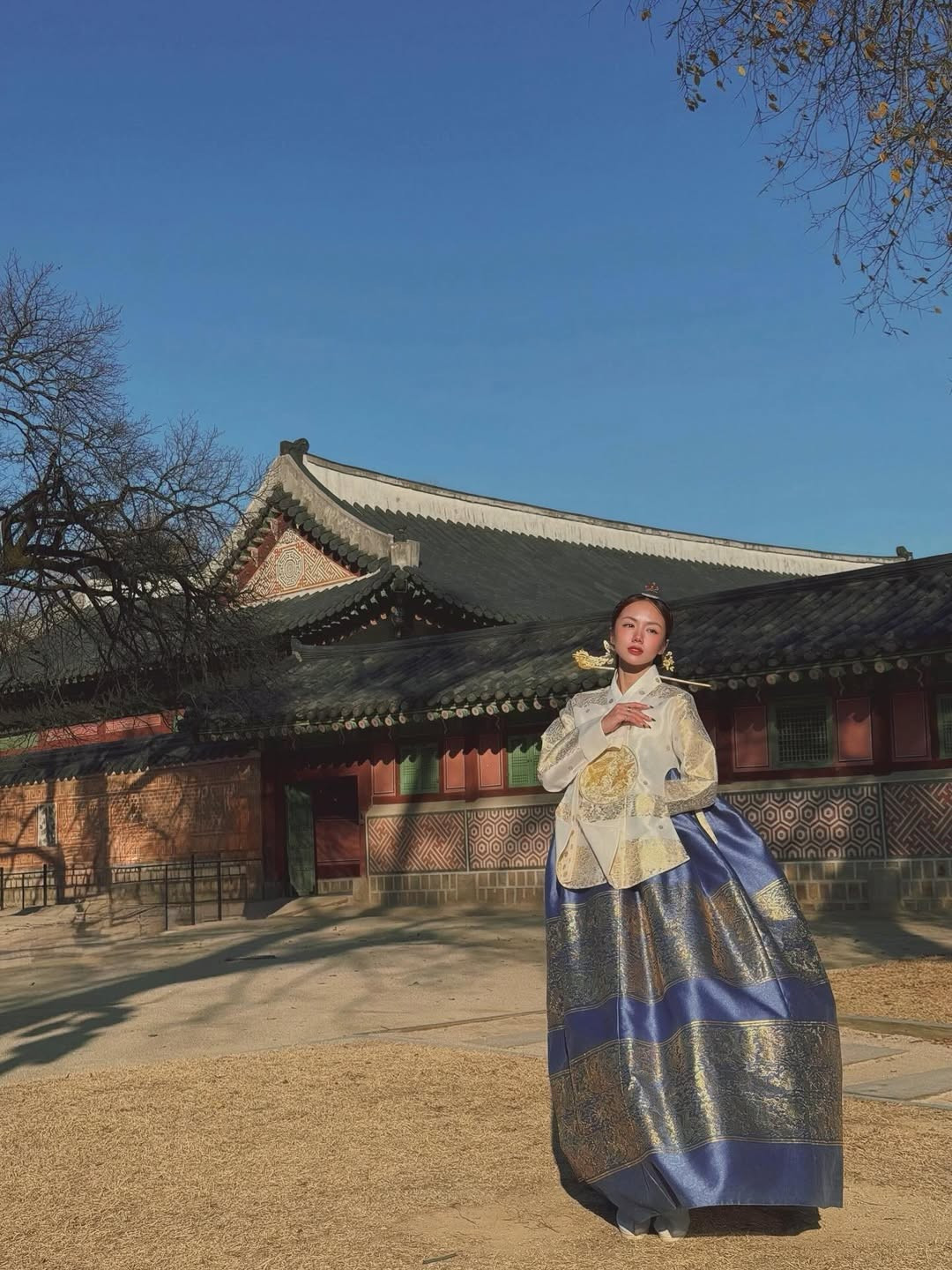 Trong các bức hình, Phương Ly xuất hiện với hanbok mang tông trắng – xanh – vàng sang trọng, họa tiết thêu tinh xảo, tạo nên vẻ đẹp quyền quý như bước ra từ một bộ phim cổ trang.