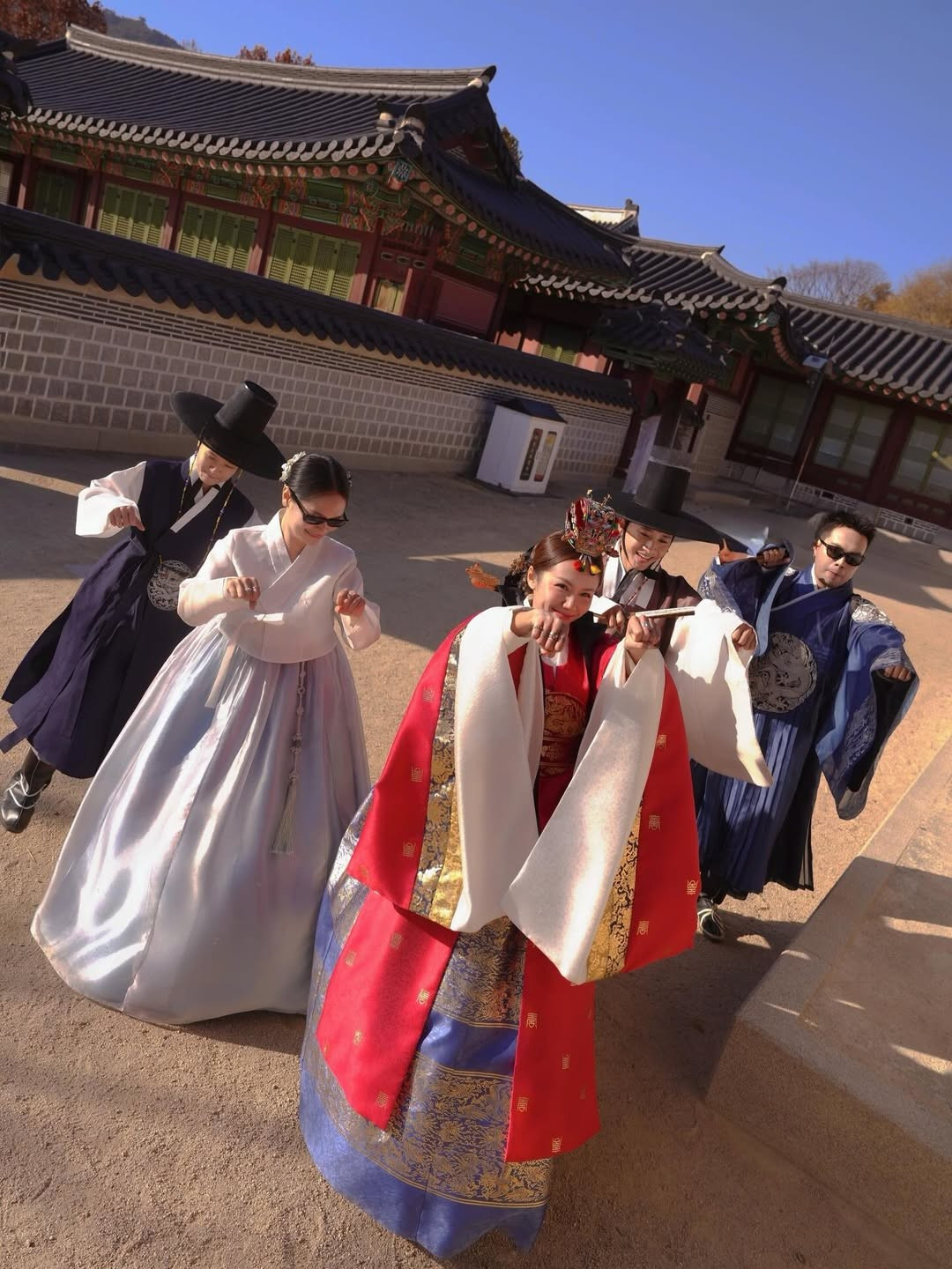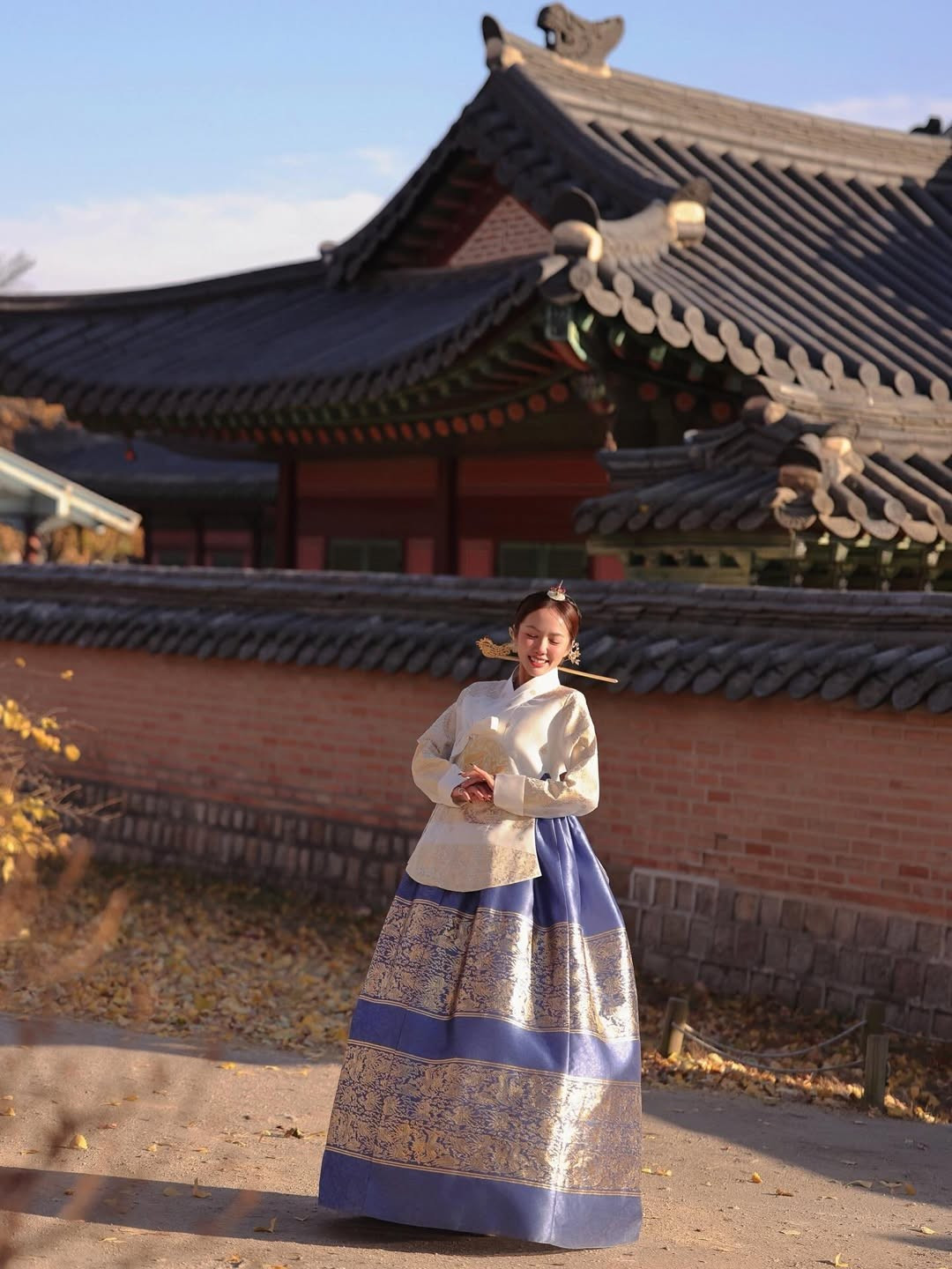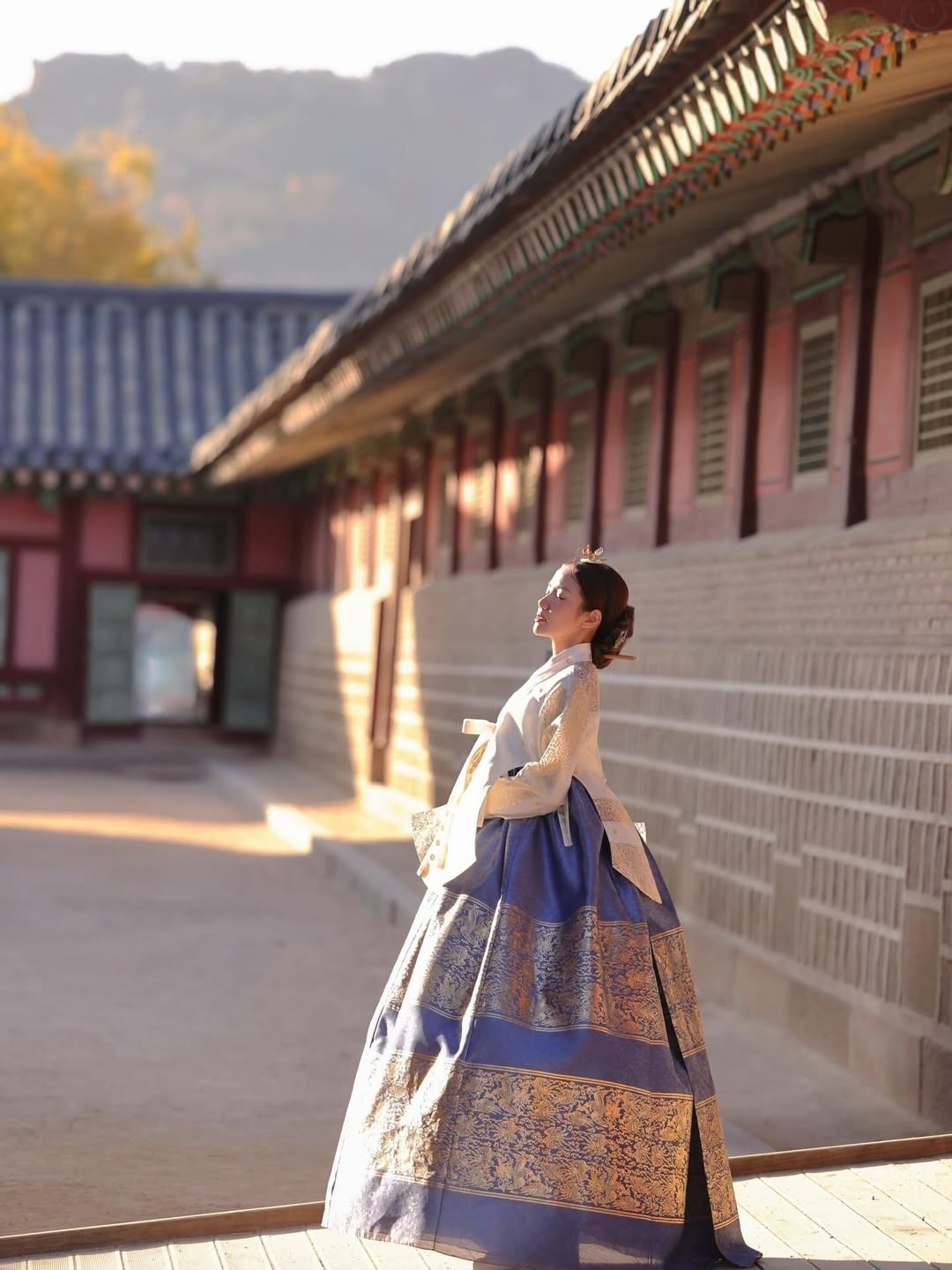 Trong các bức hình, Phương Ly xuất hiện với hanbok mang tông trắng – xanh – vàng sang trọng, họa tiết thêu tinh xảo, tạo nên vẻ đẹp quyền quý như bước ra từ một bộ phim cổ trang.