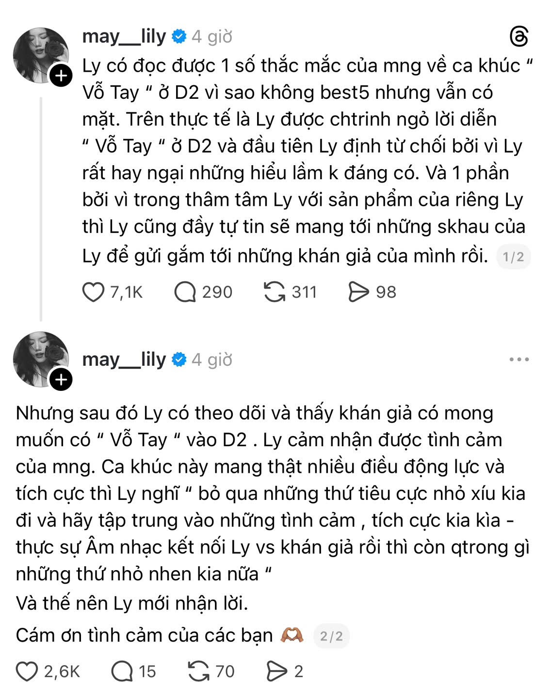 Trước những thắc mắc từ công chúng, Phương Ly đã đăng tải bài viết giải thích. Nữ ca sĩ cho biết, cô từng có ý định từ chối khi nhận được lời mời từ chương trình vì lo ngại có thể gây ra những hiểu lầm không đáng có. Tuy nhiên, với niềm tin vào thông điệp tích cực của ca khúc cũng như cảm nhận được sự mong đợi của khán giả, Phương Ly đã quyết định trình diễn Vỗ Tay tại đêm .