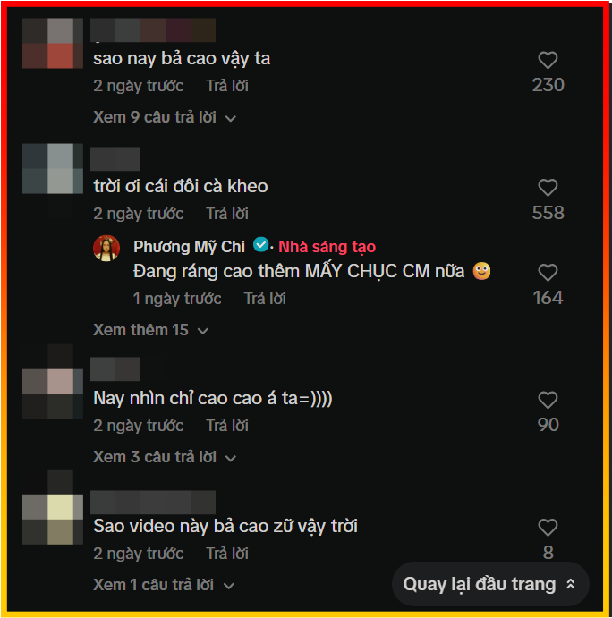 Một số khán giả nhận ra rằng chiều cao của Phương Mỹ Chi trong đêm diễn có phần khác thường so với hình ảnh quen thuộc. Khi nhiều ý kiến đặt nghi vấn về việc cô sử dụng giày độn hoặc giày đế cao quá khổ, nữ ca sĩ không né tránh mà hài hước phản hồi: “Đang ráng thêm mấy chục cm nữa”. Câu trả lời nhanh nhẹn, duyên dáng giúp không khí tranh luận trở nên nhẹ nhàng hơn, đồng thời cho thấy sự cởi mở của giọng ca trẻ trước những bàn tán trên mạng xã hội.
