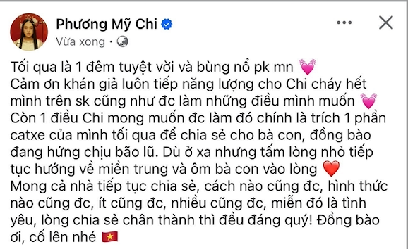 Cụ thể, trên trang cá nhân, Phương Mỹ Chi chia sẻ về đêm diễn đầy cảm xúc, nơi cô nhận được tình yêu và năng lượng lớn từ khán giả. Tuy nhiên, điều khiến mọi người quan tâm không chỉ là sân khấu rực rỡ mà còn là tấm lòng của cô dành cho miền Trung giữa lúc khó khăn.