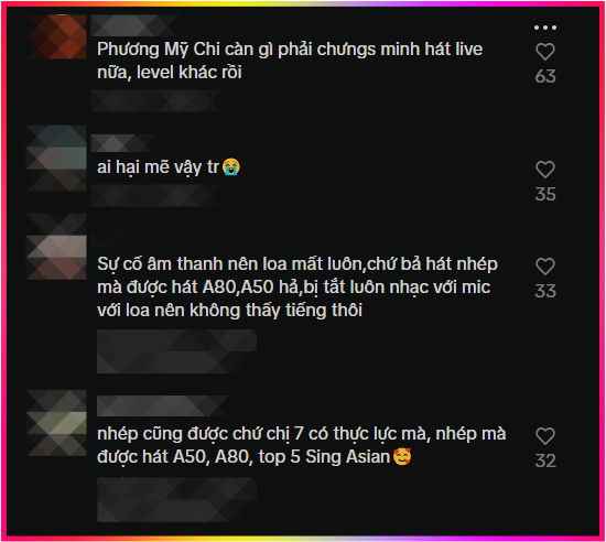 Một bộ phận người hâm mộ còn khẳng định, Phương Mỹ Chi vốn là ca sĩ có năng lực thanh nhạc vững vàng, từng nhiều lần thể hiện khả năng hát live ổn định trong các chương trình lớn. Suốt chặng đường hoạt động nghệ thuật, cô luôn được giới chuyên môn và khán giả đánh giá cao về kỹ thuật, cảm xúc và phong cách trình diễn chuyên nghiệp, những yếu tố khó có thể hòa hợp nếu chỉ phụ thuộc vào phần thu âm.