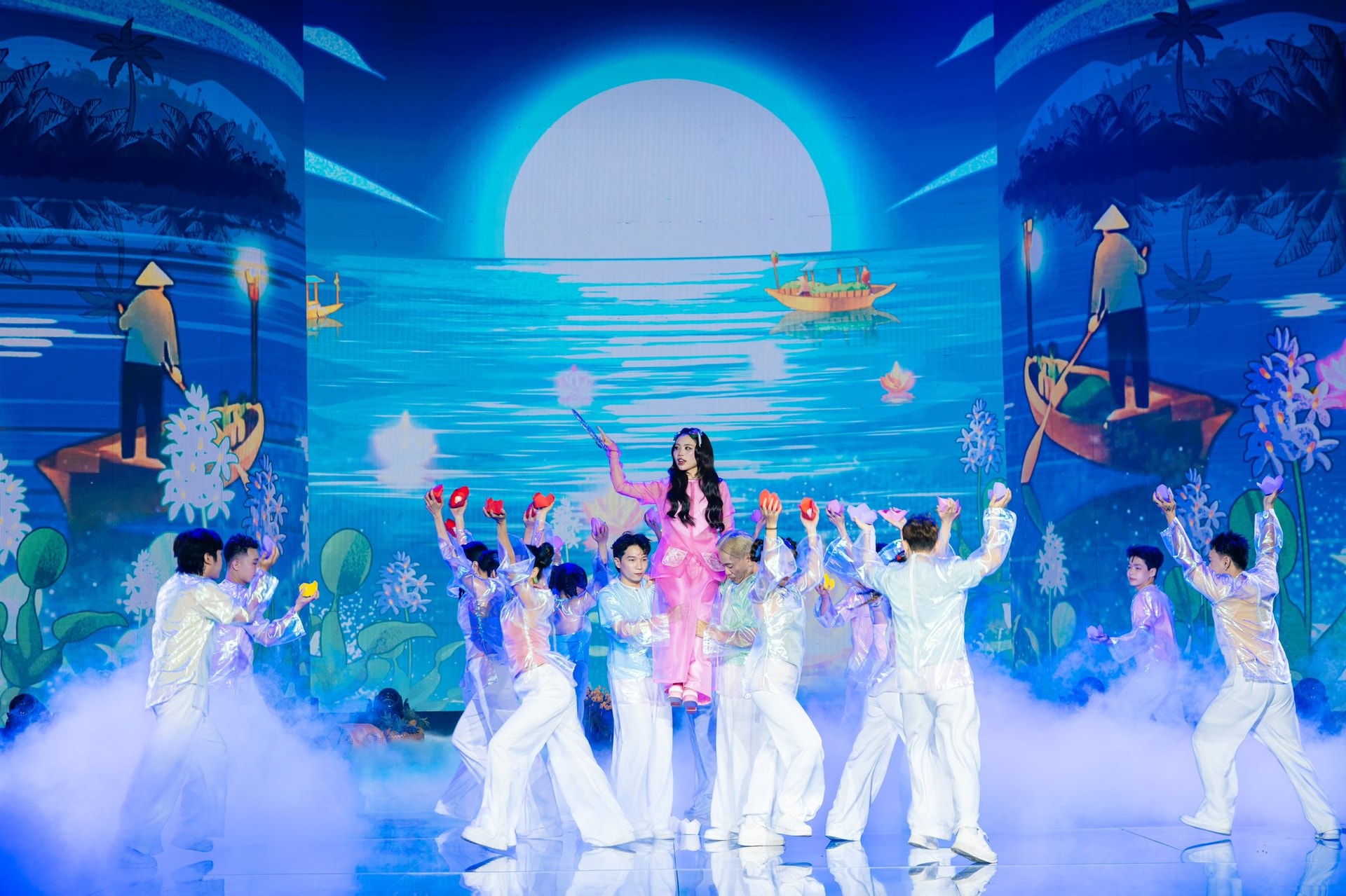 Để phục vụ cho tiết mục năm nay, Phương Mỹ Chi đã sử dụng chiếc quạt bằng lá cọ làm đạo cụ chính. Sự chuẩn bị kỹ lưỡng này không chỉ giúp tiết mục thêm phần sinh động mà còn thể hiện tư duy đào sâu vào chất liệu văn hóa dân gian của nghệ sĩ trẻ.