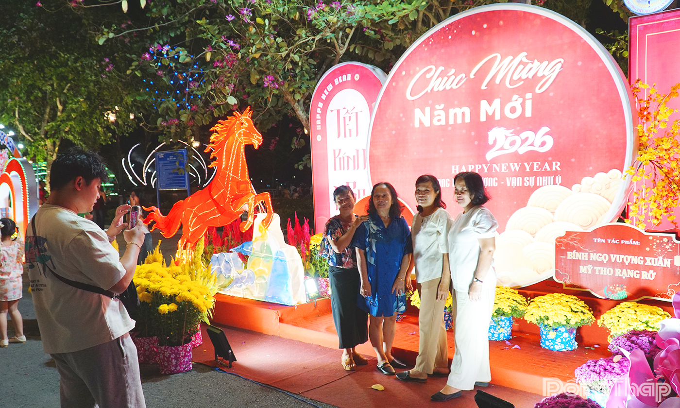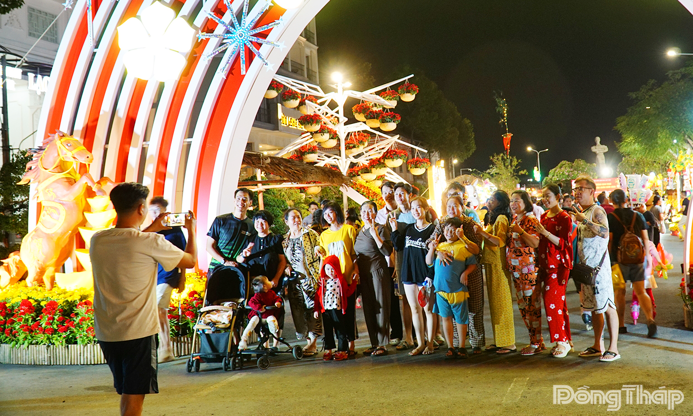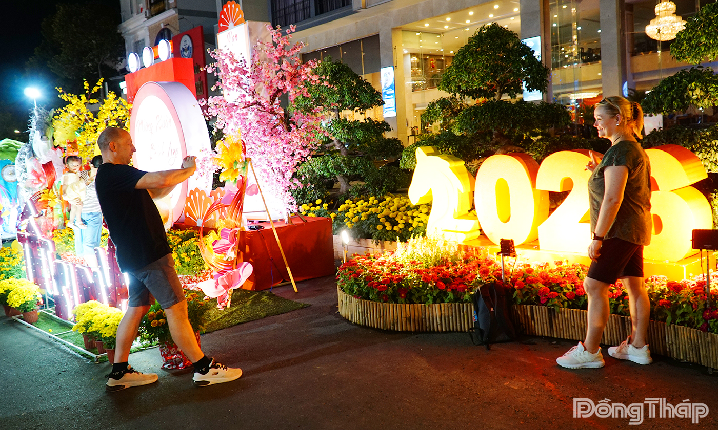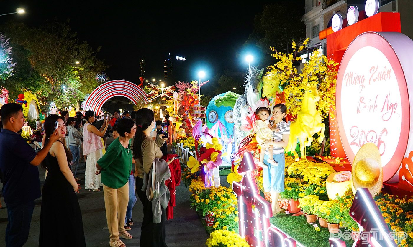Du khách đến tham quan và chụp hình tại Đường hoa xuân Mỹ Tho 2026.