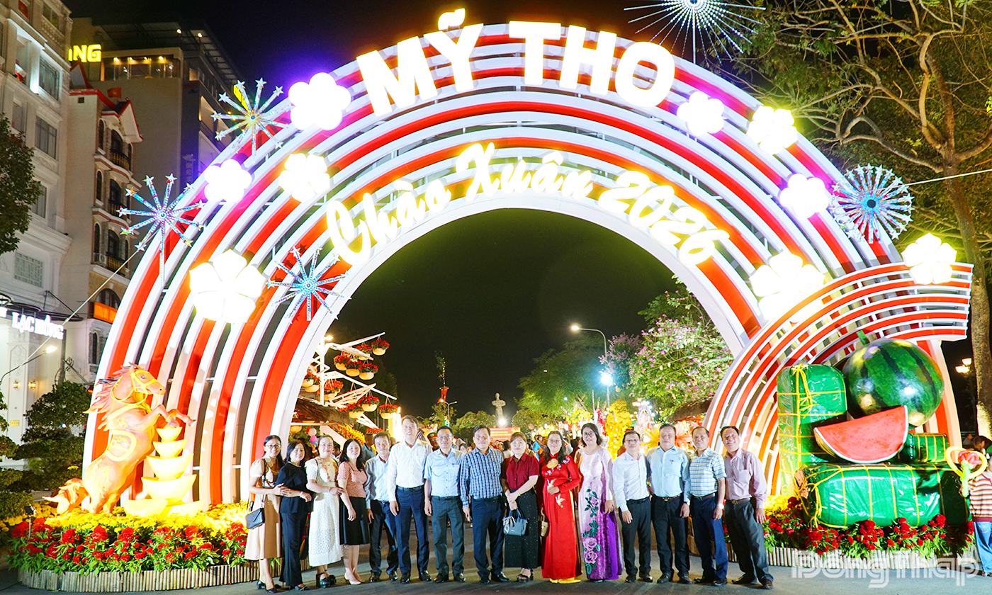 Đại biểu chụp hình lưu niệm tại Đường hoa xuân Mỹ Tho 2026.