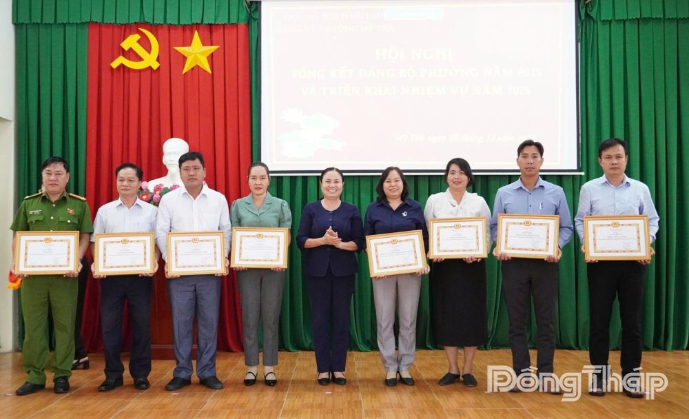 Bí thư Đảng ủy, Chủ tịch Hội đồng nhân dân phường Mỹ Trà Trần Thị Quý khen thưởng cho 9 tổ chức cơ sở đảng đạt tiêu chuẩn hoàn thành xuất sắc nhiệm vụ tiêu biểu năm 2025.