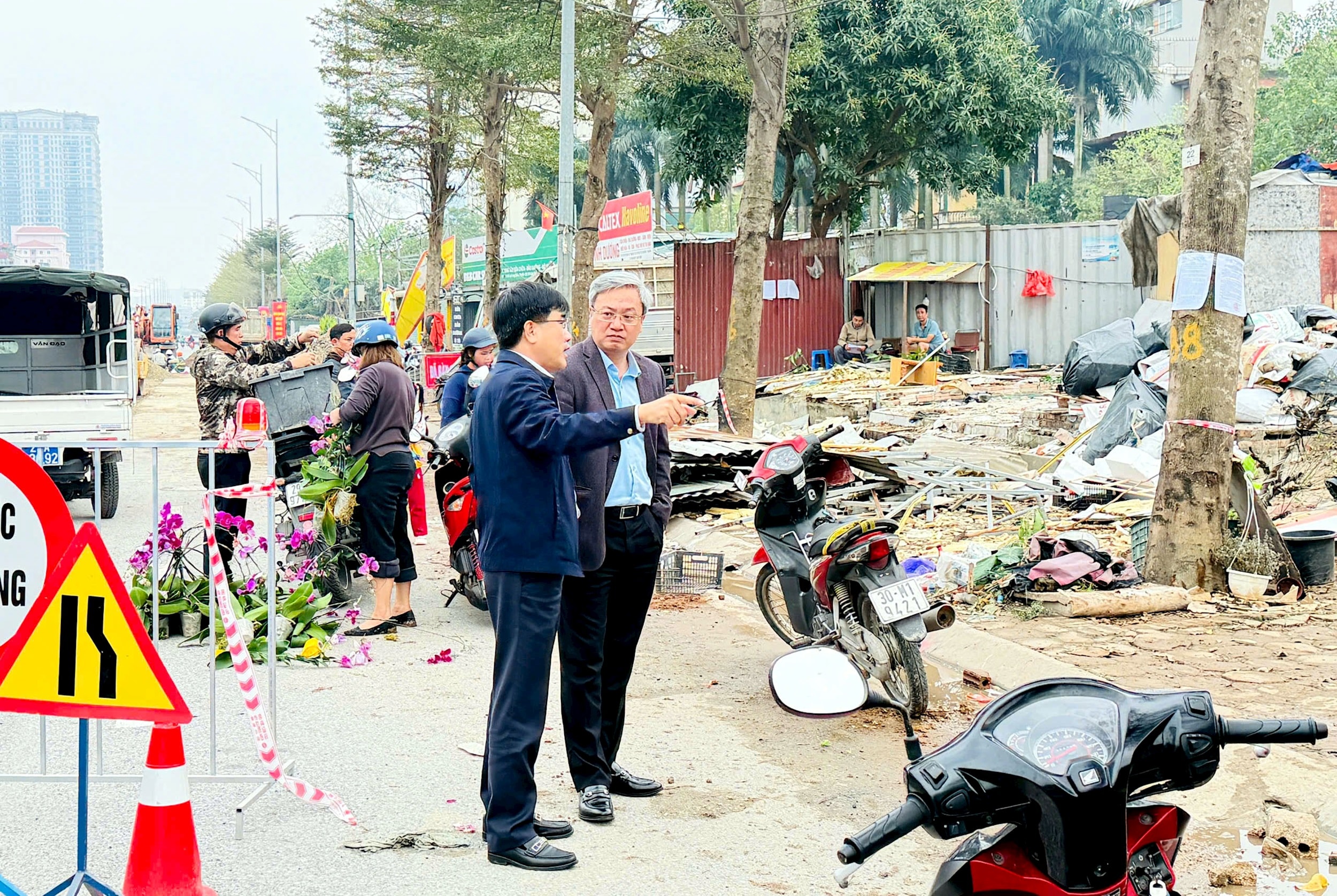 Lãnh đạo phường Nghĩa Đô xuống kiểm tra hiện trường trước khi giải phóng mặt bằng. Ảnh: NĐ