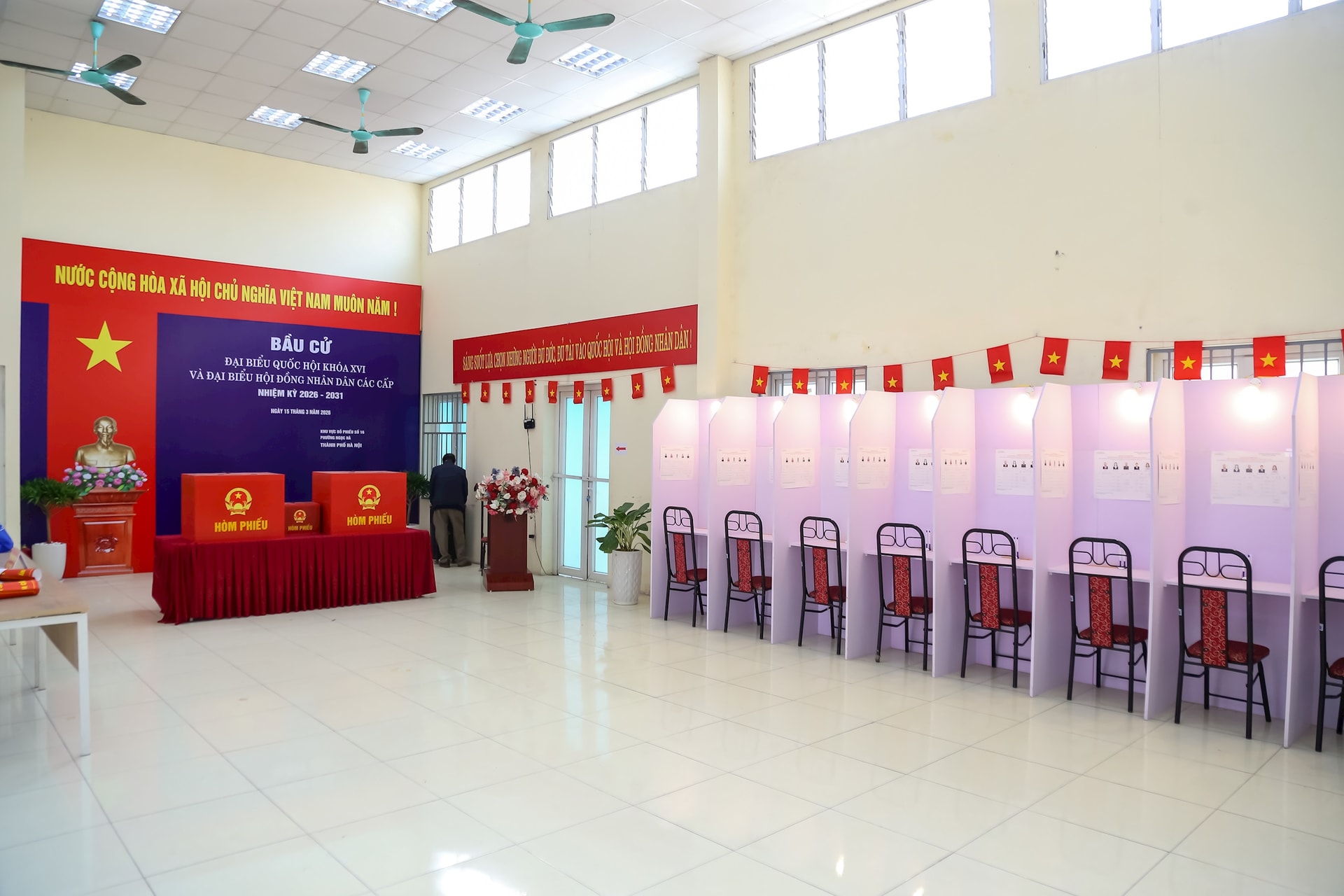 Theo ghi nhận của phóng viên, tại các khu vực bỏ phiếu trên địa bàn phường Ngọc Hà, công tác trang trí đã hoàn tất. Bên trong các điểm bầu cử, bàn ghế phục vụ cử tri đã được bố trí gọn gàng, khoa học. Danh sách trích ngang của các ứng cử viên đại biểu Quốc hội và đại biểu HĐND các cấp được niêm yết công khai, giúp cử tri dễ dàng tìm hiểu thông tin trước khi bỏ phiếu.