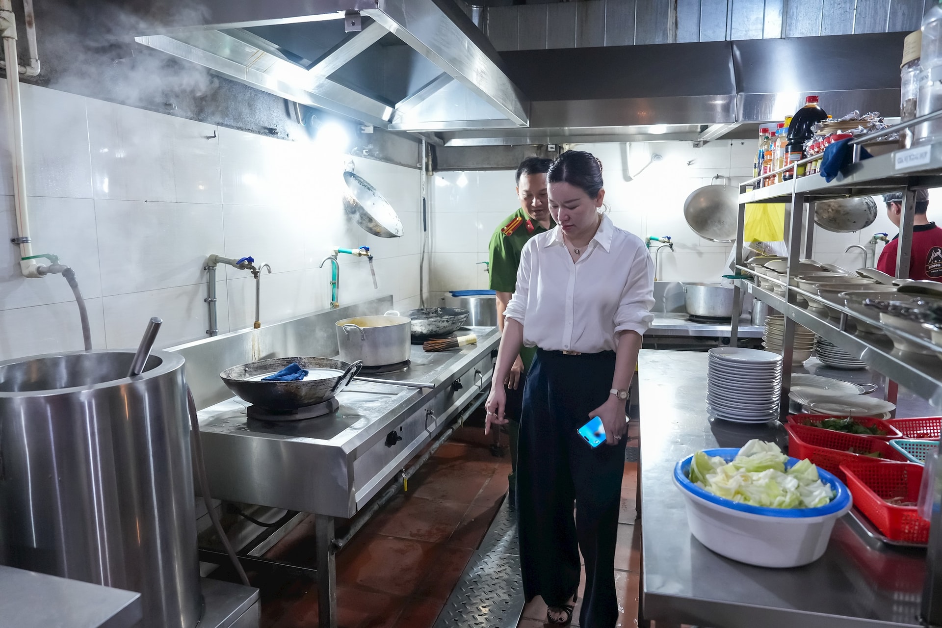Đoàn công tác kiểm tra tại một nhà hàng ở ngõ 279 Đội Cấn. Ảnh: Duy Khánh