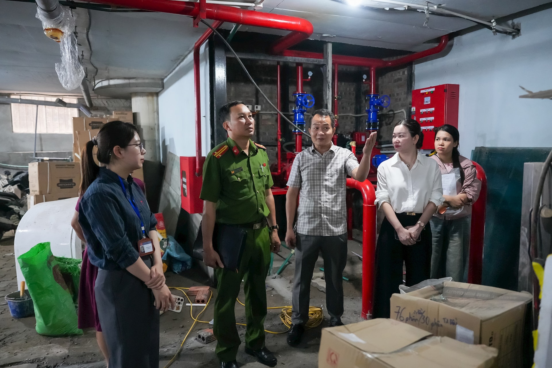 Đoàn công tác kiểm tra khu xử lý nước thải tại nhà hàng trong ngõ 279 Đội Cấn. Ảnh: Duy Khánh