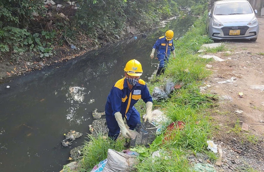 Công nhân vớt rác thải, khơi thông dòng chảy tại mương Kẻ Khế. Ảnh: VC