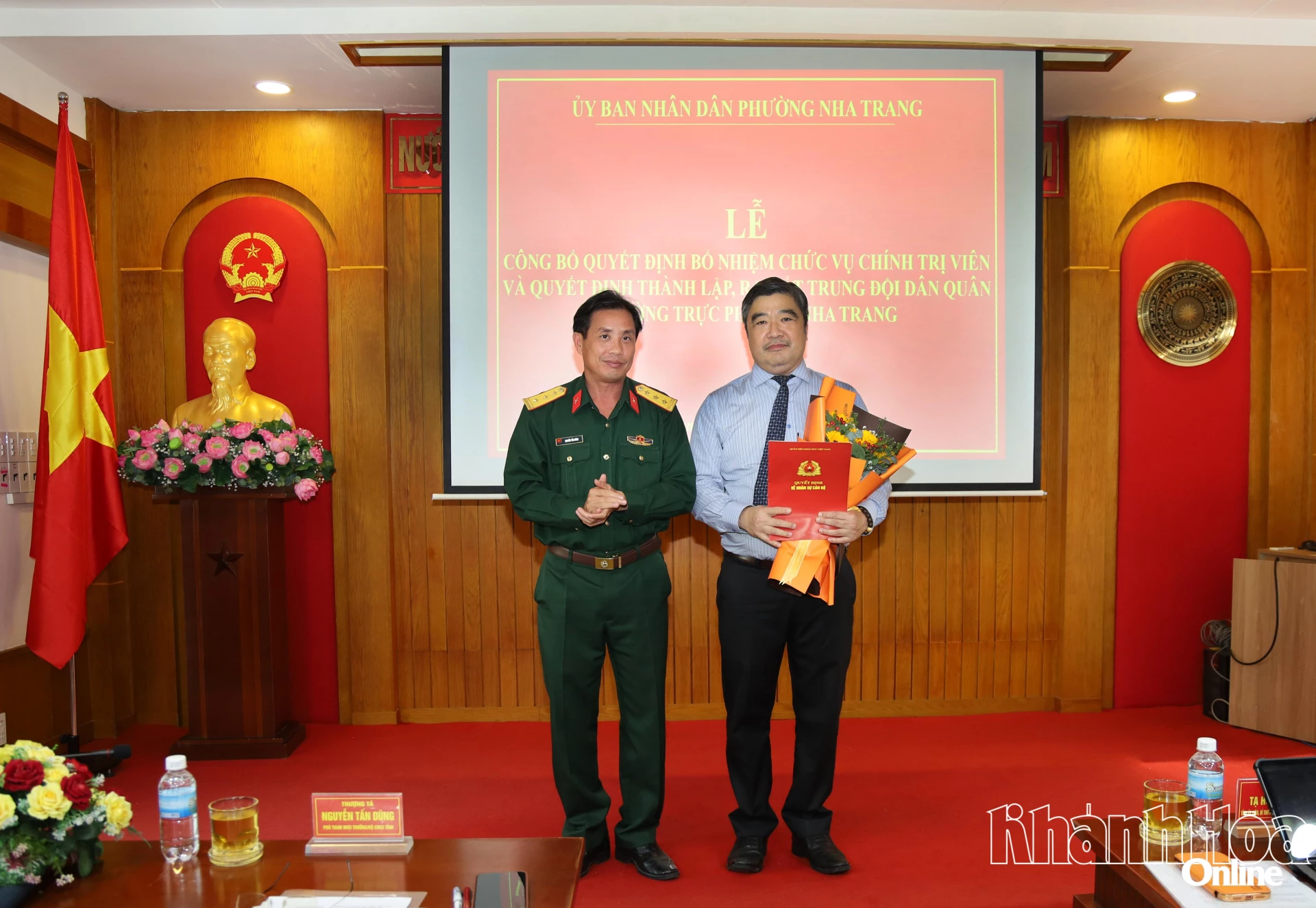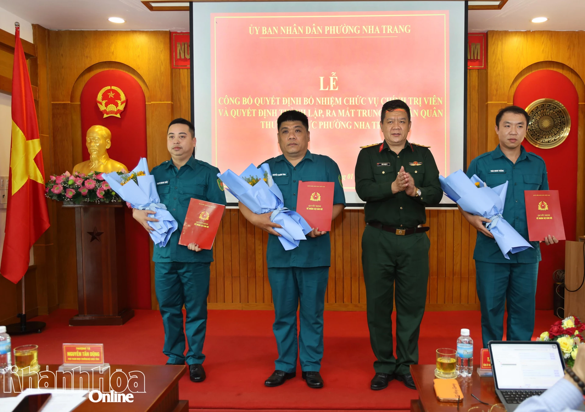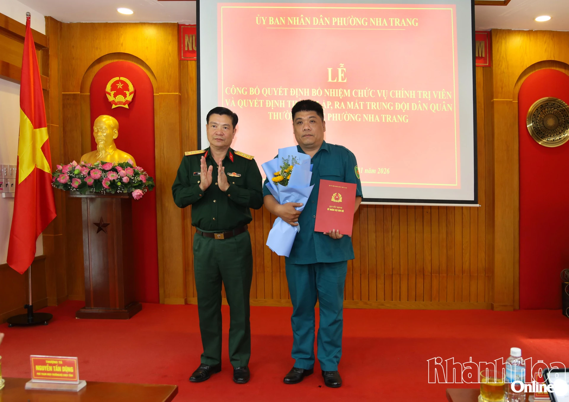 Tại buổi lễ, đại diện Ban Chỉ huy quân sự phường công bố quyết định của Chủ tịch UBND tỉnh bổ nhiệm ông Tạ Hồng Quang giữ chức vụ Chính trị viên Ban Chỉ huy quân sự phường; quyết định của Bộ Chỉ huy quân sự tỉnh về thành lập Trung đội Dân quân thường trực phường thuộc Ban Chỉ huy quân sự phường Nha Trang từ ngày 30-12-2025. Trung đội gồm: 1 trung đội, 3 tiểu đội, với 28 dân quân; thực hiện chức năng, nhiệm vụ, chế độ hoạt động theo Luật Dân quân tự vệ năm 2019 và các văn bản hướng dẫn liên quan.