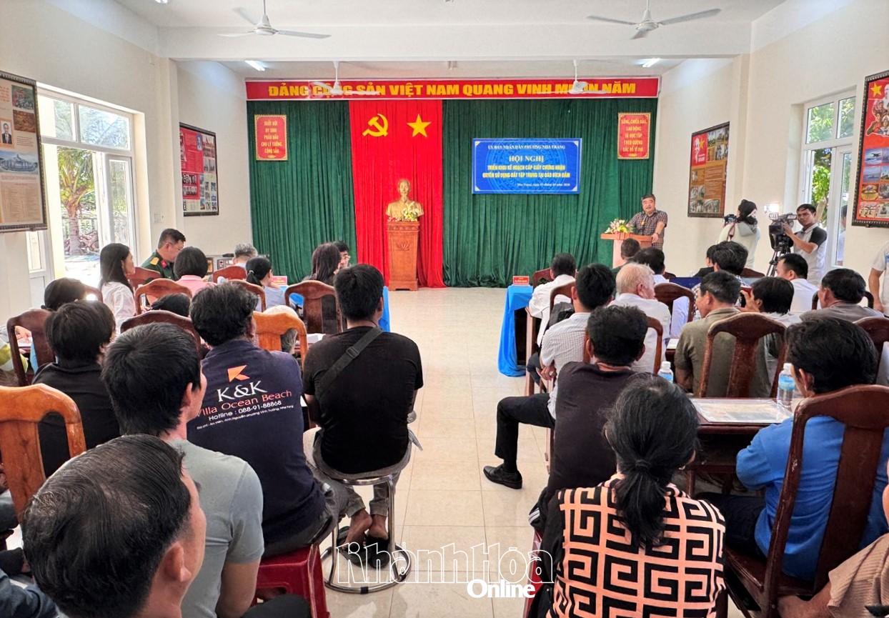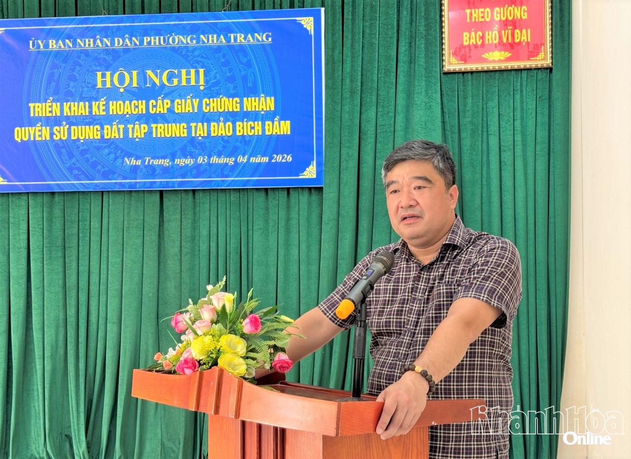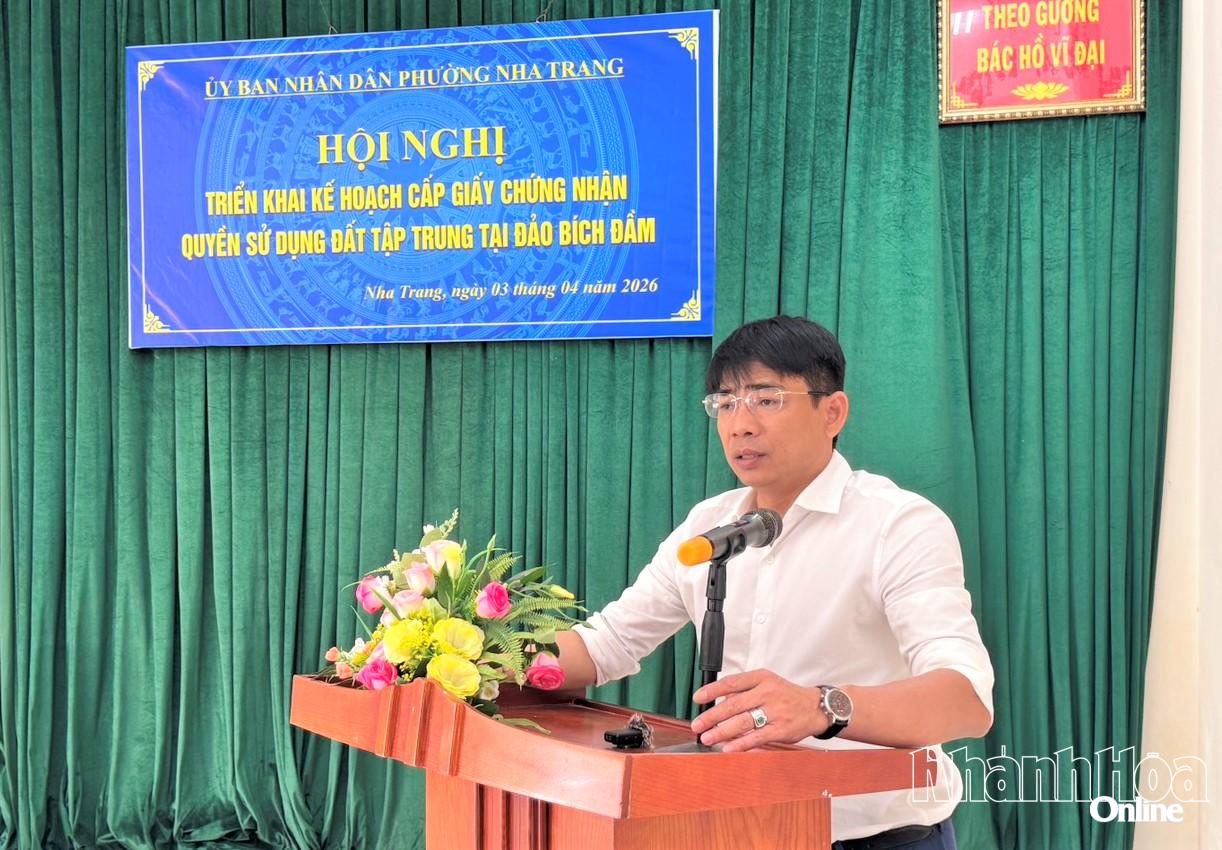 Ngày 3-4, tại Tổ dân phố Bích Đầm (đảo Hòn Tre, phường Nha Trang), UBND phường tổ chức hội nghị triển khai việc cấp giấy chứng nhận (GCN) quyền sử dụng đất tập trung. Tham dự hội nghị có các ông: Tạ Hồng Quang - Bí thư Đảng ủy, Chủ tịch HĐND phường; Trần Xuân Tây - Chủ tịch UBND phường; các thành viên tổ công tác lưu động của phường, Đồn Biên phòng Bích Đầm và người dân Tổ dân phố Bích Đầm.