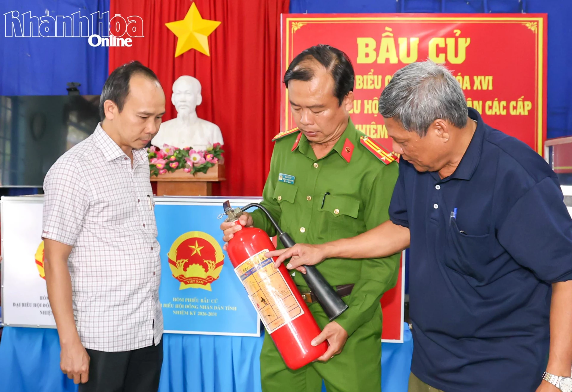 Lãnh đạo phường, Công an phường Ninh Hòa và thành viên Tổ bầu cử kiểm tra bình chữa cháy được trang bị tại khu vực bỏ phiếu.