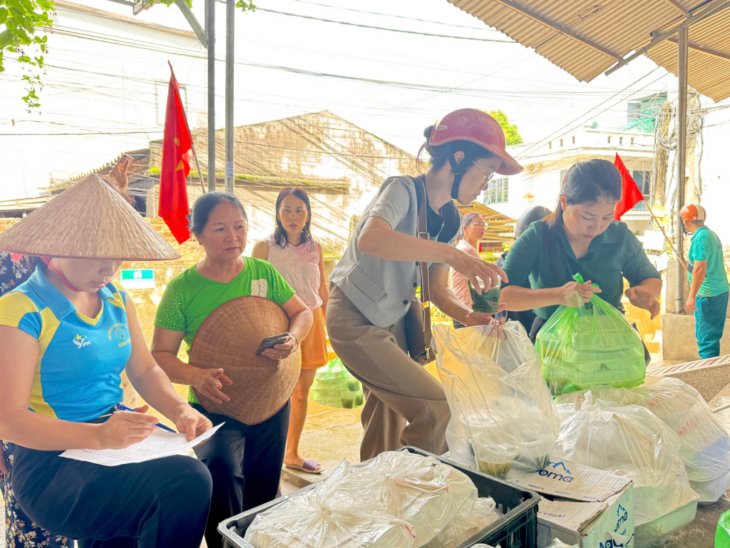 Các đội thiện nguyện, đoàn viên thanh niên, nhà hảo tâm phường Nùng Chí Cao chuẩn bị các suất cơm hỗ trợ người dân khu vực ngập lụt.