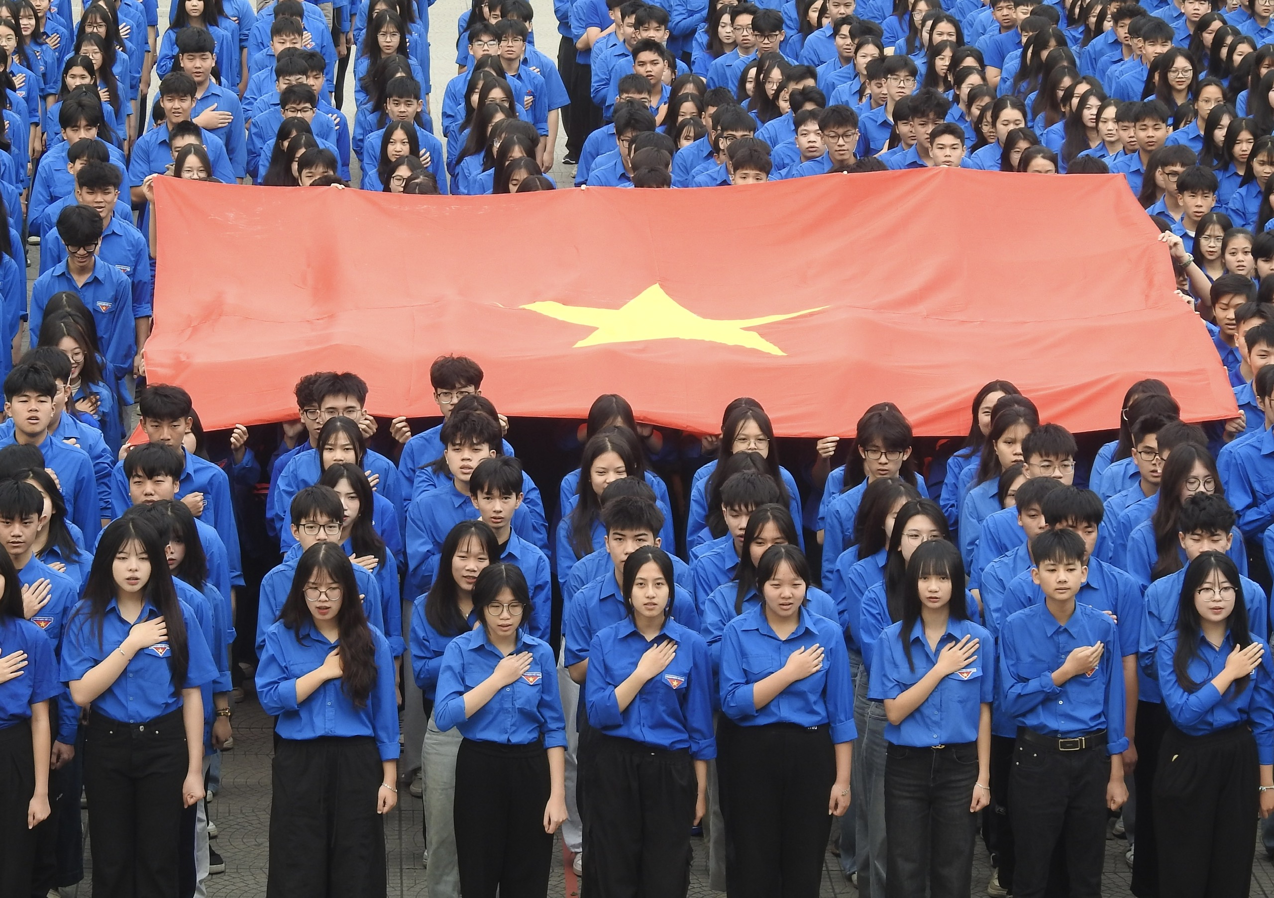 Hơn 1.400 học sinh Trường THPT Thành phố, phường Nùng Trí Cao chào cờ và sinh hoạt dưới cờ trước giờ khai mạc Đại hội XIV của Đảng.