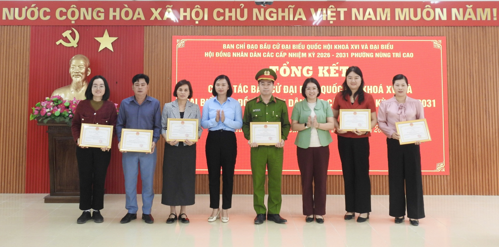 Lãnh đạo Ban Tuyên giáo và Dân vận Tỉnh ủy và phường Nùng Trí Cao trao giấy khen cho các tập thể có thành tích xuất sắc trong phong trào thi đua lập thành tích trong công tác bầu cử đại biểu Quốc hội khóa XVI và đại biểu HĐND các cấp, nhiệm kỳ 2026 - 2031.