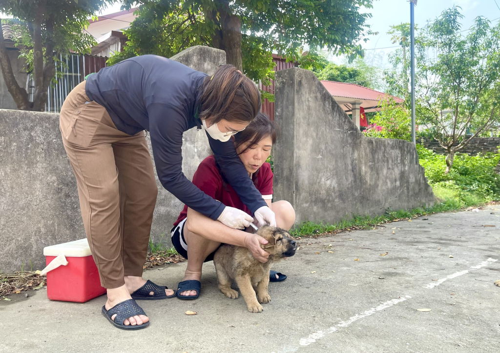 Cán bộ thú y tiêm vắc xin phòng bệnh dại cho chó tại tổ dân phố 4, phường Nùng Trí Cao.