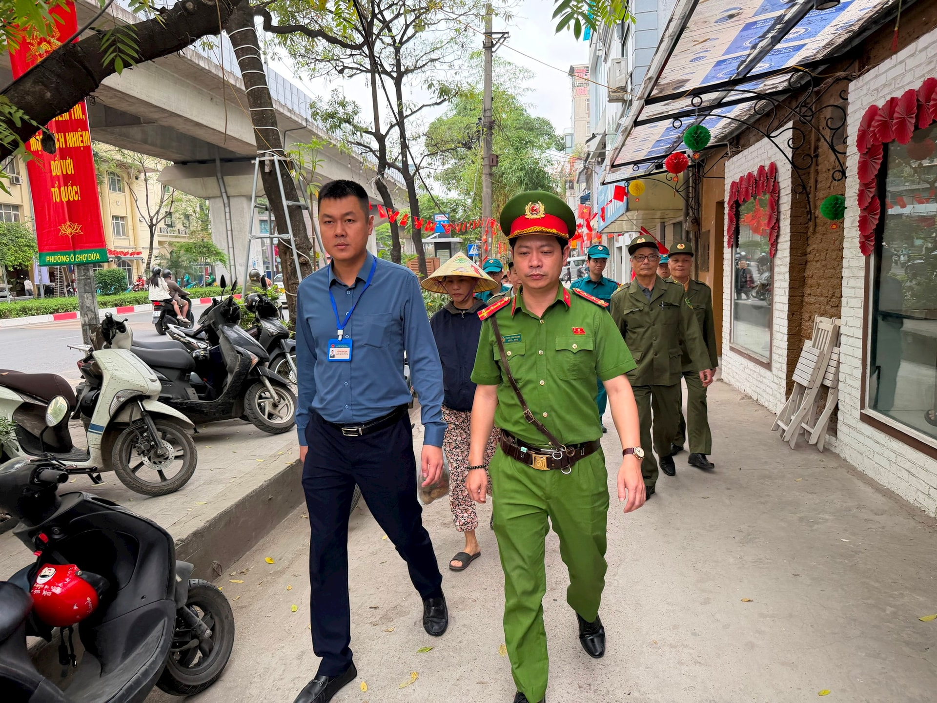 Lực lượng Công an phường Ô Chợ Dừa cùng các đơn vị chức năng kiểm tra trật tự đô thị trên tuyến phố Hào Nam. Ảnh: Võ Giang