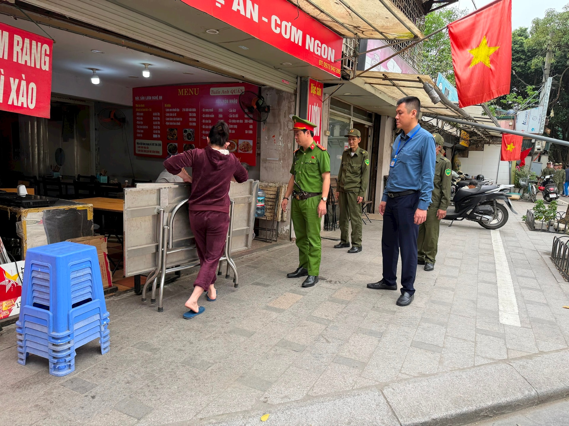 Tổ công tác phường Ô Chợ Dừa nhắc nhở hộ kinh doanh sắp xếp bàn ghế gọn gàng, bảo đảm thông thoáng vỉa hè. Ảnh: Võ Giang