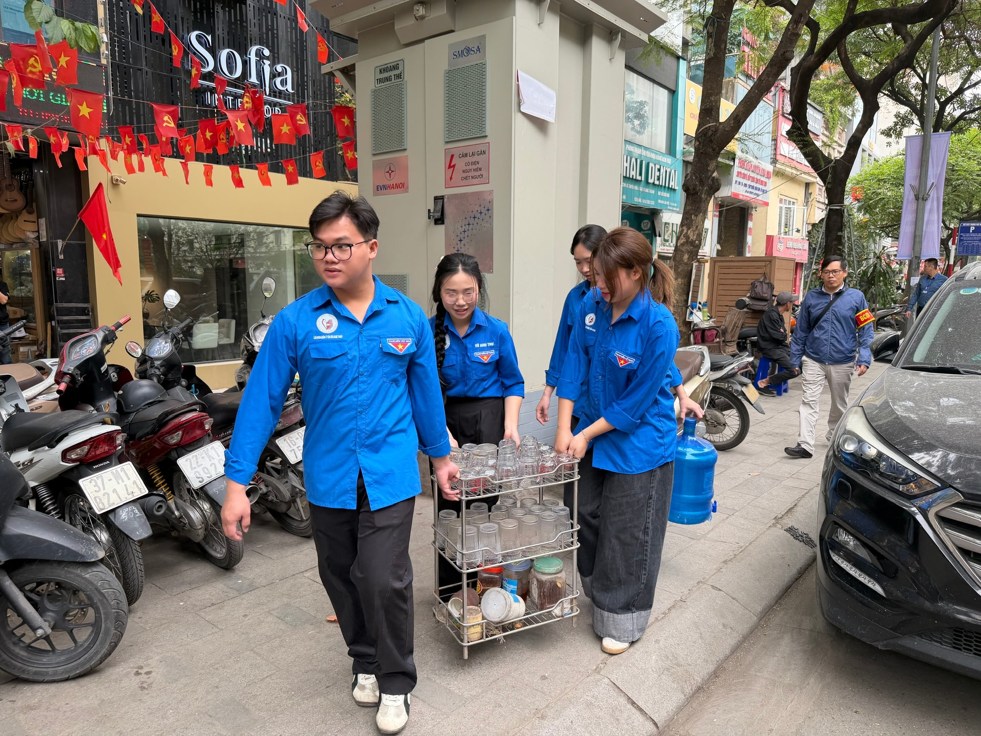 Đoàn viên thanh niên phường Ô Chợ Dừa hỗ trợ thu gom, sắp xếp đồ dùng lấn chiếm vỉa hè. Ảnh: Võ Giang