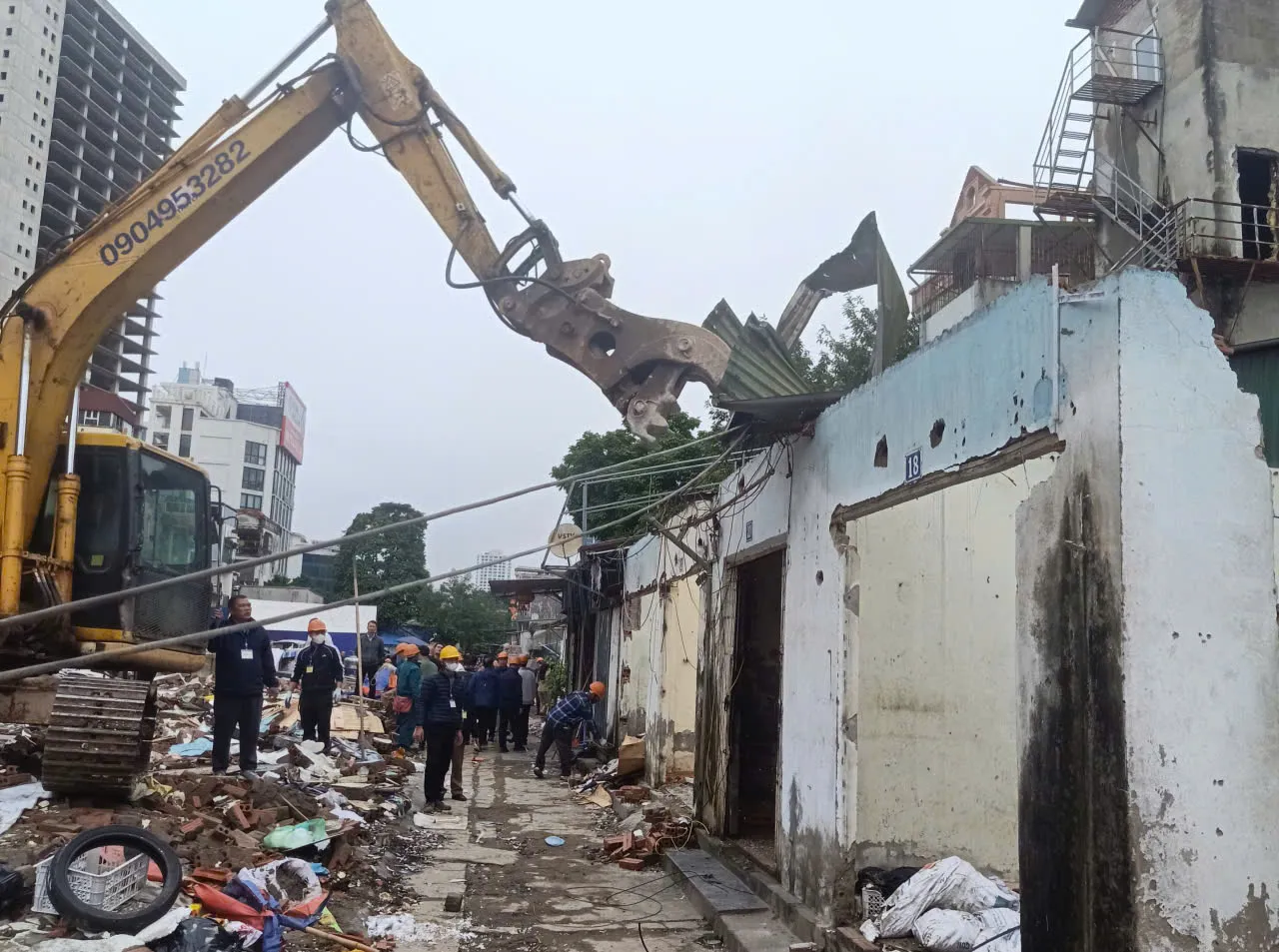 Lực lượng chức năng phường Ô Chợ Dừa thực hiện cưỡng chế đối với công trình Hợp tác xã Nông nghiệp Hoàng Cầu (do ông Đ.V.T đang sử dụng) tại số 20A cùng khu, diện tích 30,8m².