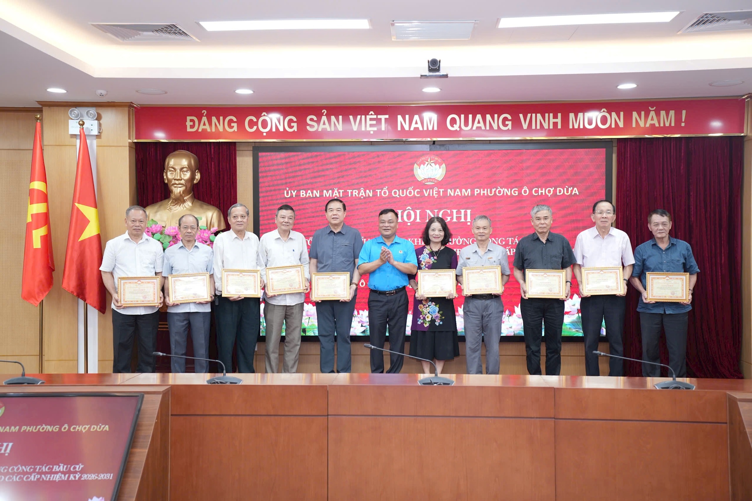 Cũng tại hội nghị, Ủy ban MTTQ Việt Nam phường Ô Chợ Dừa đã tổng kết, biểu dương, khen thưởng các tập thể, cá nhân có nhiều đóng góp trong công tác bầu cử đại biểu Quốc hội khóa XVI và đại biểu HĐND các cấp nhiệm kỳ 2026-2031 trên địa bàn. Hoạt động này nhằm ghi nhận những nỗ lực trong công tác phối hợp, tuyên truyền, vận động nhân dân tham gia bầu cử, góp phần bảo đảm cuộc bầu cử diễn ra đúng luật, an toàn, dân chủ.