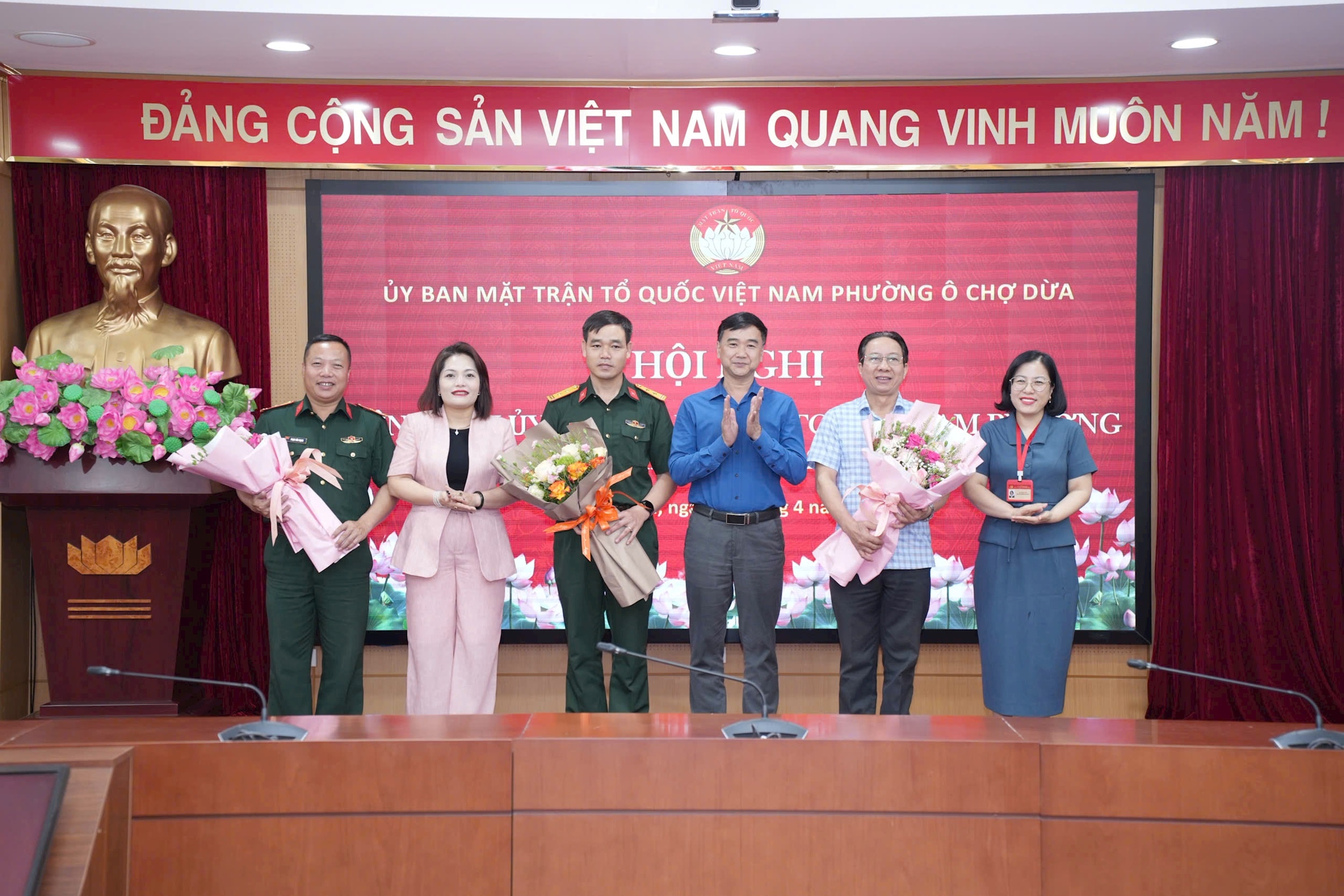 Tặng hoa chúc mừng, tri ân các nhân sự tại hội nghị kiện toàn Ủy viên Ủy ban MTTQ Việt Nam phường Ô Chợ Dừa nhiệm kỳ 2025-2030. Ảnh: P.V