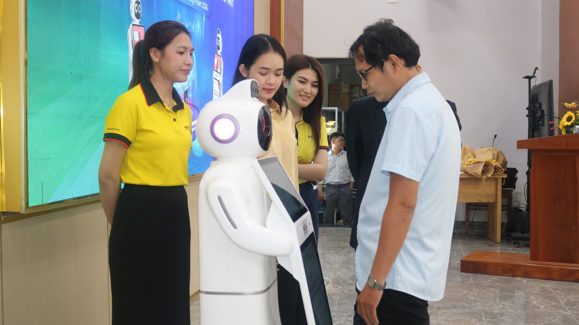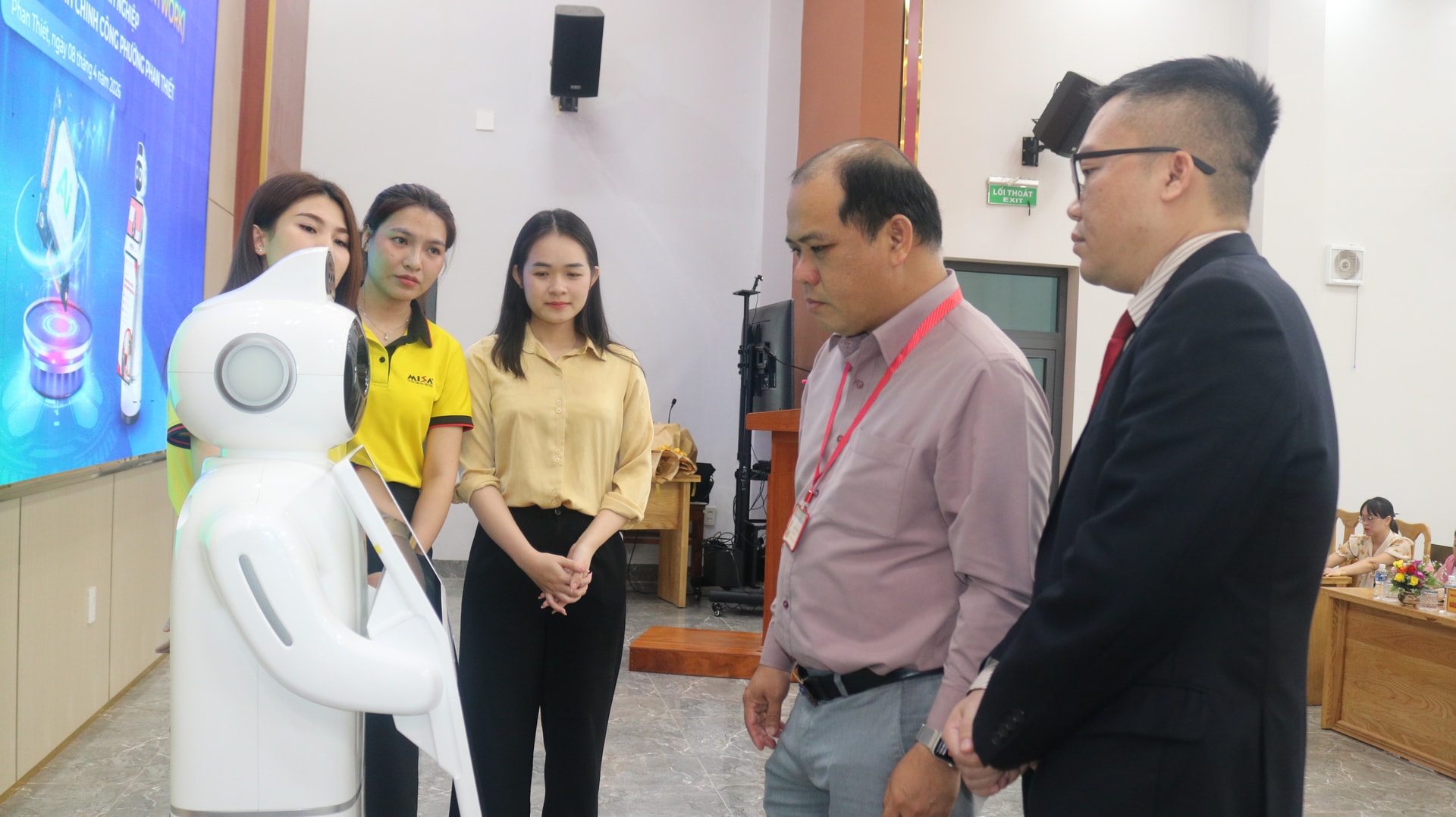 Chủ tịch UBND phường Phan Thiết Trần Nguyên Lộc (thứ 2 bên phải) trải nghiệm với robot MISA