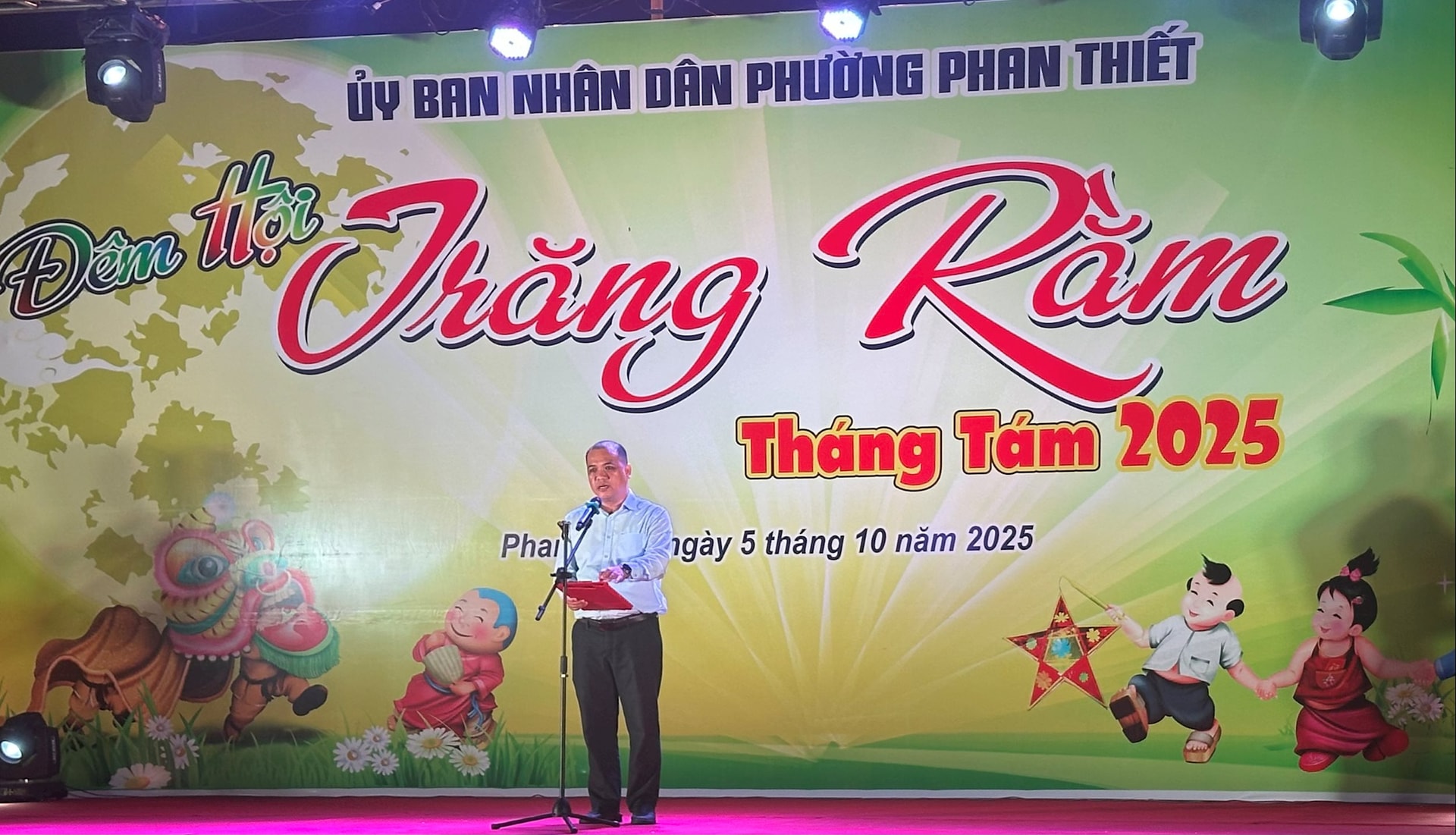 Chủ tịch UBND phường Phan Thiết Trần Nguyên Lộc đọc thư chúc Tết Trung thu của Chủ tịch nước đến các em thiếu niên, nhi đồng.