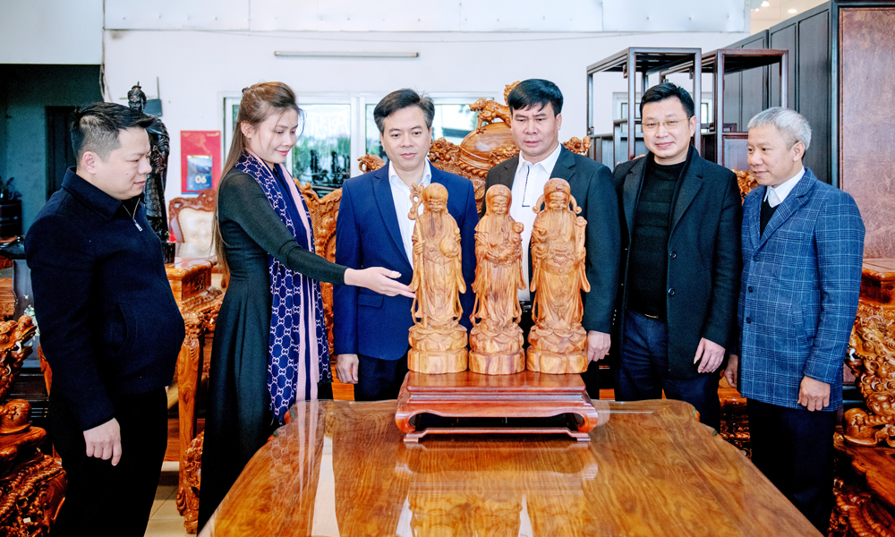 Các đồng chí lãnh đạo phường Phù Khê thăm cơ sở sản xuất nghề gỗ mỹ nghệ.