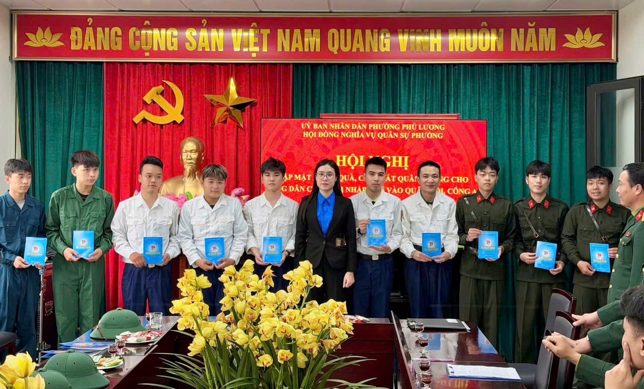 Lãnh đạo phường Phú Lương trao quà động viên các tân binh chuẩn bị lên đường nhập ngũ. Ảnh: PV